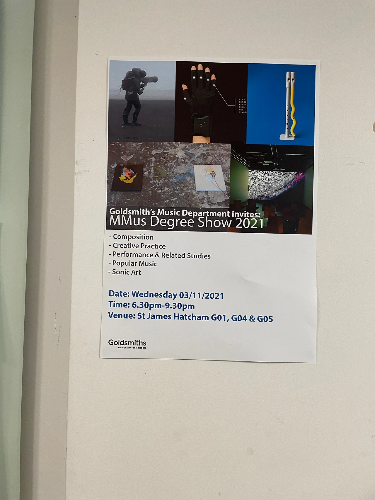 Mmus는 보통의 음대와 달리, 컨템퍼러리 성향이 강한 골드스미스 특징 상 실험적인 성격이 강하다. 그래서 클래식 음악이나 악기 연주 심화 과정이 아니라, 실험 음악, 음악 퍼포먼스, 음악 설치, 그리고 대중음악 전공중점이기 때문이다. 포스터에 적혀있는 세부 전공을 살펴보면, Composition, Creative practice, Performance & Related Studies, Popular music, Sonic art.