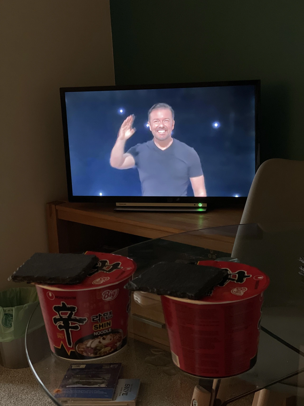 리키 저베이스 스탠딩 코미디 보면서 컵라면.