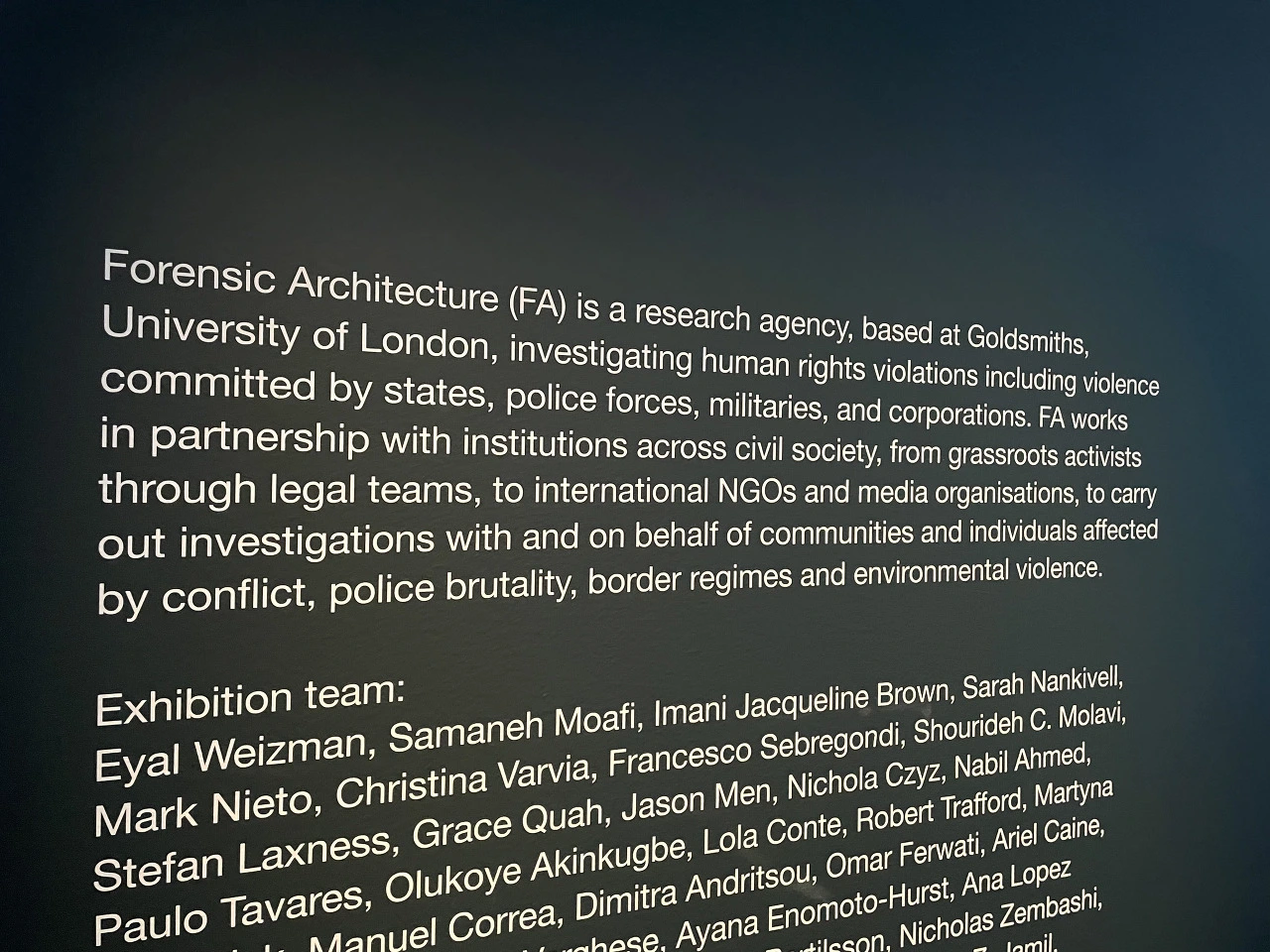 포렌식 아키텍처는 리서치 그룹으로, 정치적인 성향이 강한 집단이다. 주로 사회적 문제를 다루며 접근방식을 포렌식 연구에 두고 있는데, 연구 집단이지만, 그 결과물을 보여주는 매체로 3D 프린팅작품, 다큐먼트, 영상, 사진 등을 다양하게 활용해서 현대미술관에서 많은 러브콜을 받고 있다.