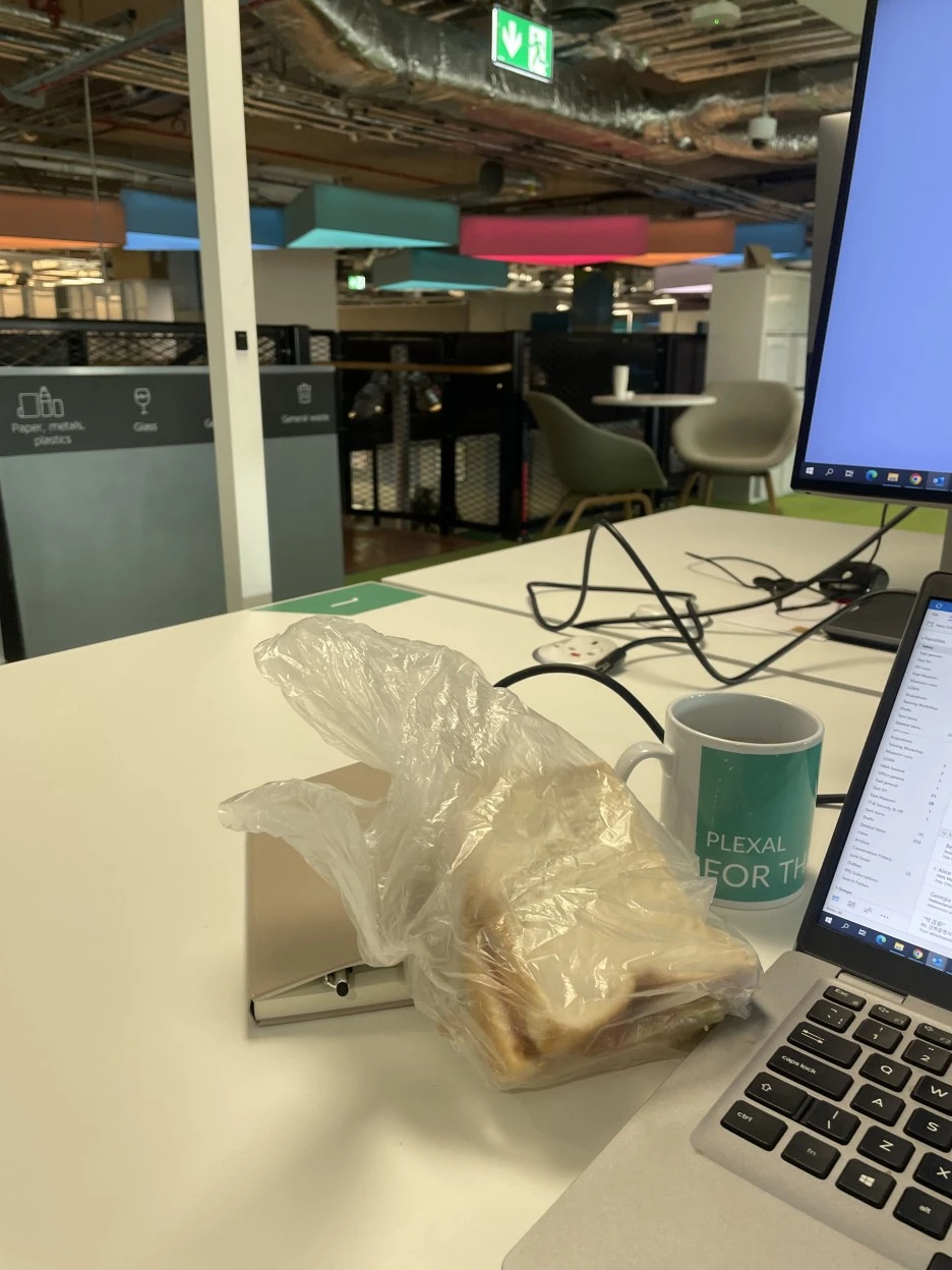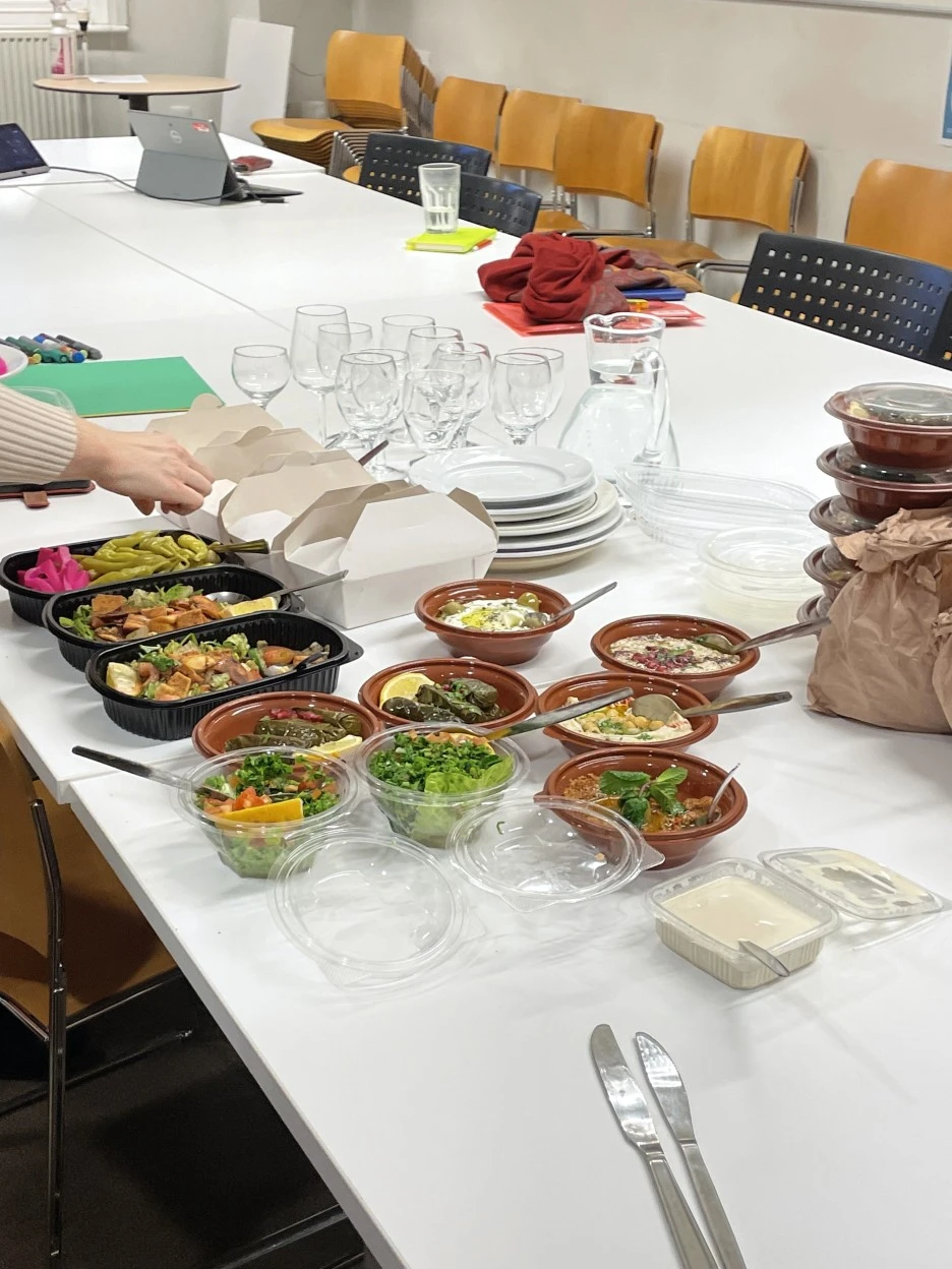 흔치않은 야근도 했다. 같이 어떤 전시할 공간에 대해 토론하고 어떻게 하면 미술관이 관객을 instruct 하지 않고 이야기를 펼칠 수 있는 공간이 될 수 있는지 고민. 퇴근하고 나서 이루어진 세션이라 근처 중동식당에서 음식도 사왔다. 그 와중에 완전 비건음식인 것도 완전 영국 미술관 스러움.