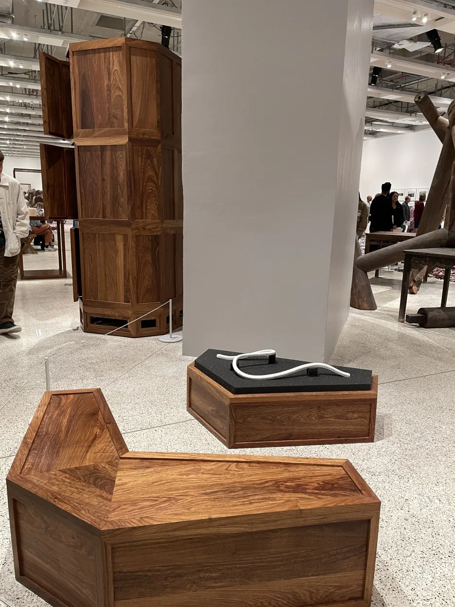 Life vest snake, 2019. 2008년 사천 지진과 유럽의 난민 위기의 희생자들을 위한 작품. 뱀 한 개는 구명조끼로 다른 밤 하나는 학교 배낭으로 만들어졌다. 작가는 작품을 통해 사회에서 가장 힘없는 존재들을 조망하고 싶었고, 뱀을 차용한 이유는 복잡하고 예기치 못한 위기를 표현하기 위한 것.