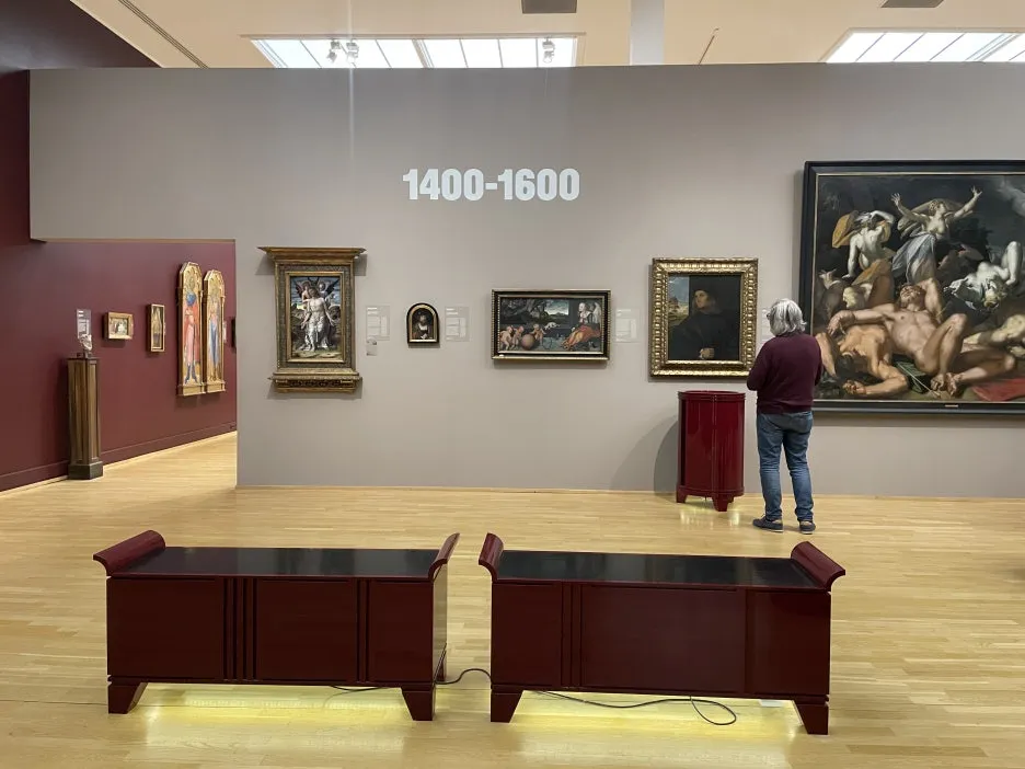 상대적으로 관심이 덜한 시대지만, 그래도 온 김에 다 보겠다는 마음으로 갔던 첫 번째 전시관. (이게 얼마나 잘못된 선택이었던지. 미술관 크기를 너무 과소평가했다.) 첫 전시관부터 눈에 띄었던 요소는 1400-1600 년대 작품 속, contemporary intervention으로 동시대 한 스푼 넣은 덴마크 작가 Ingvar Cronhammar에 의해 디자인된 벤치와 쇼케이스.