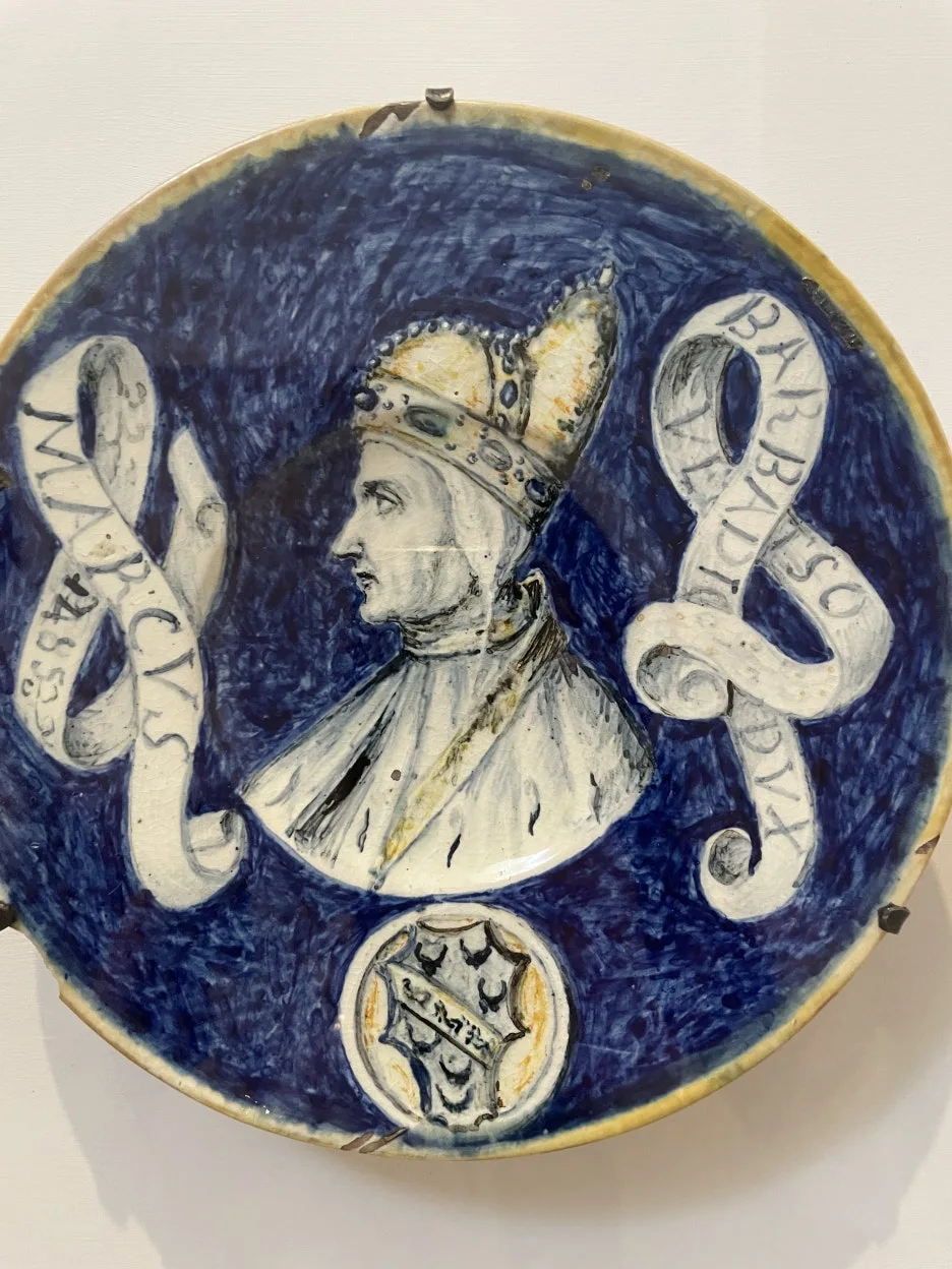 접시가 생산된 공장과 연도가 적혀있는 부분이 긁혀 사라졌고 처참한 퀄리티로 보아 누군가가 르네상스 작품인 척하고 싶어 한 19세기 접시.