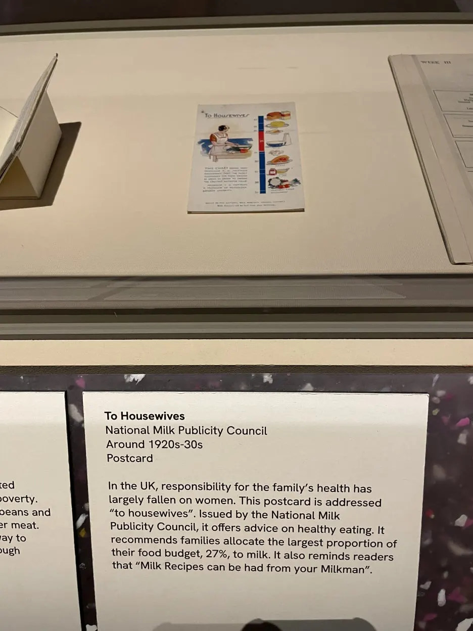 To housewives. 제목부터 웩 스러운 정부에서 배분된 1920년대 엽서. 당시 영국에서는, 가족의 건강에 대한 책임은 전부 여자에게 지어졌다. 이 엽서는 건강하게 먹는 것에 대한 조언을 담고 있는데, 이게 왜 to housewives 냐는 것. 그리고 오른편 또한 여성에게 추천된 건강한 식단을 꾸리는 레시피 조언 책.