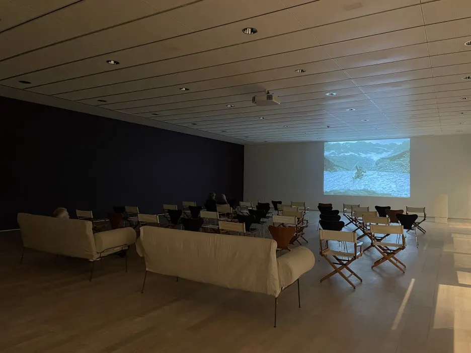 작가 인터뷰나 다큐멘터리 보는 공간. 그 와중에 이 소파 옆에 설치된 조명도 작가 작품이고 라벨도 옆에 수반되어 있었다.