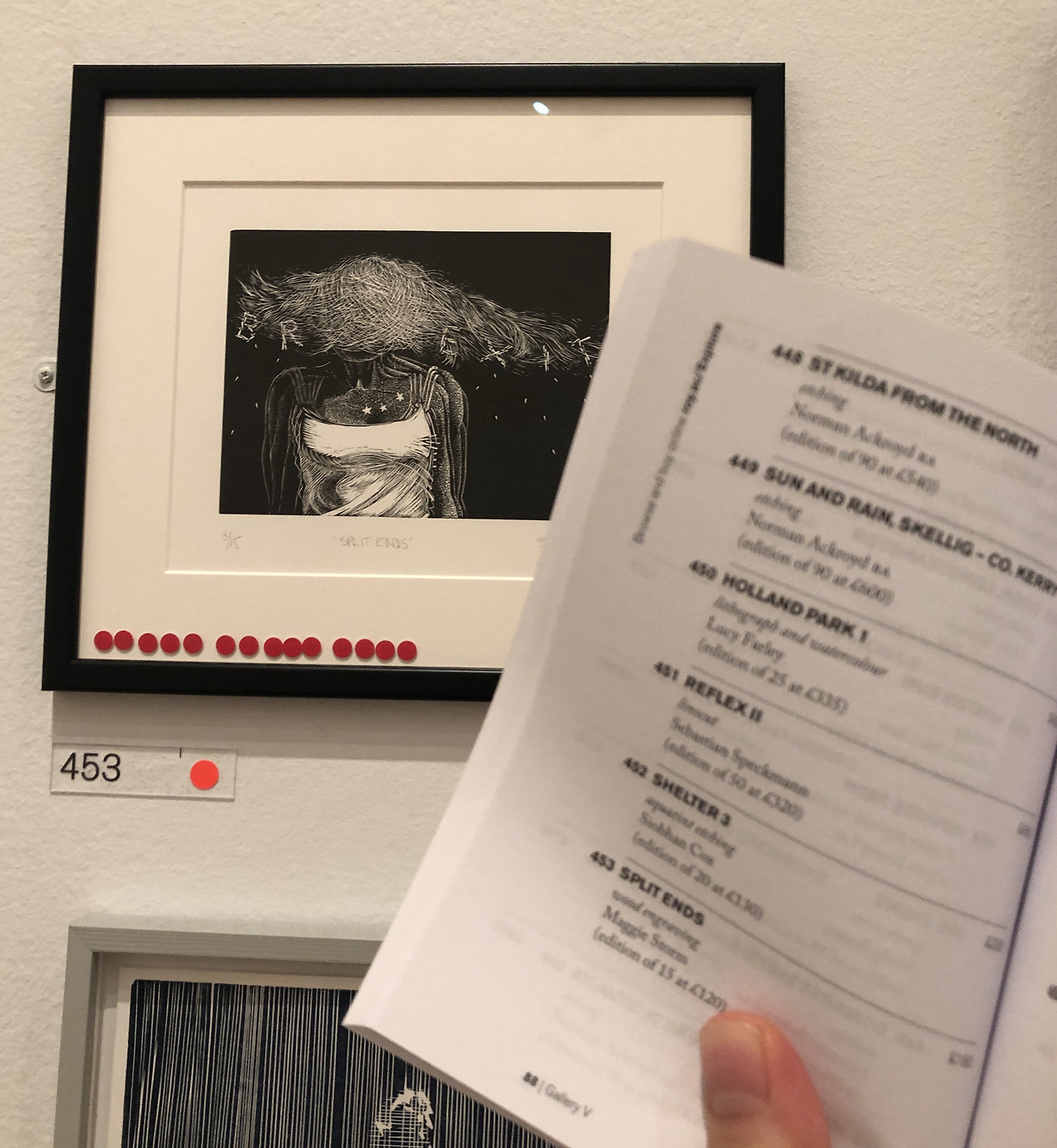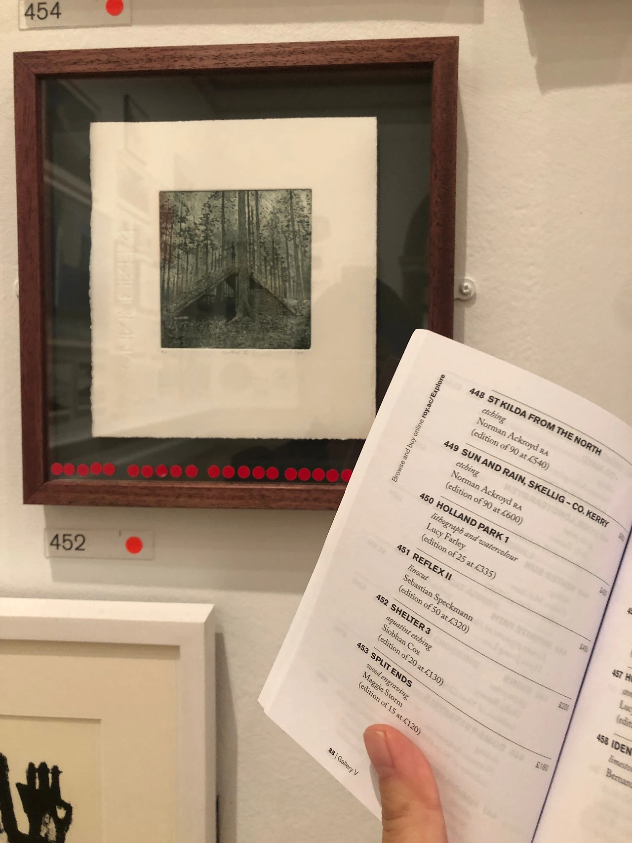 이 윈터 쇼는 아주 상업적인 전시로, 브로셔 속 작품마다 가격이 적혀있었다. 심지어 에디션이 50개까지 찍히면 싸게 해 준다는 말도 서슴없이 적혀있다. 싼 게 비지떡이라고 아래처럼, 대중의 미감에 전혀 공감하지 못하겠느 작품들이 많이 팔린 게 흥미로웠다. 오만한 생각이라고 비난 받겠지만 그저 싸서 샀다는 생각에 영국이라고 다를 바는 없구나 싶었다. (설명을 덧붙이자면 빨간 스티커는 작품이 팔렸다는 표시다. 아트페어에서 많이 봤을 거다. 세계 어딜 가나 똑같다. 특히 저런 판화와 사진 작품은 무한정 찍어낼 수 있기 때문에 에디션이 붙는다. 3번째 판화에 에디션 3 이런 식.)