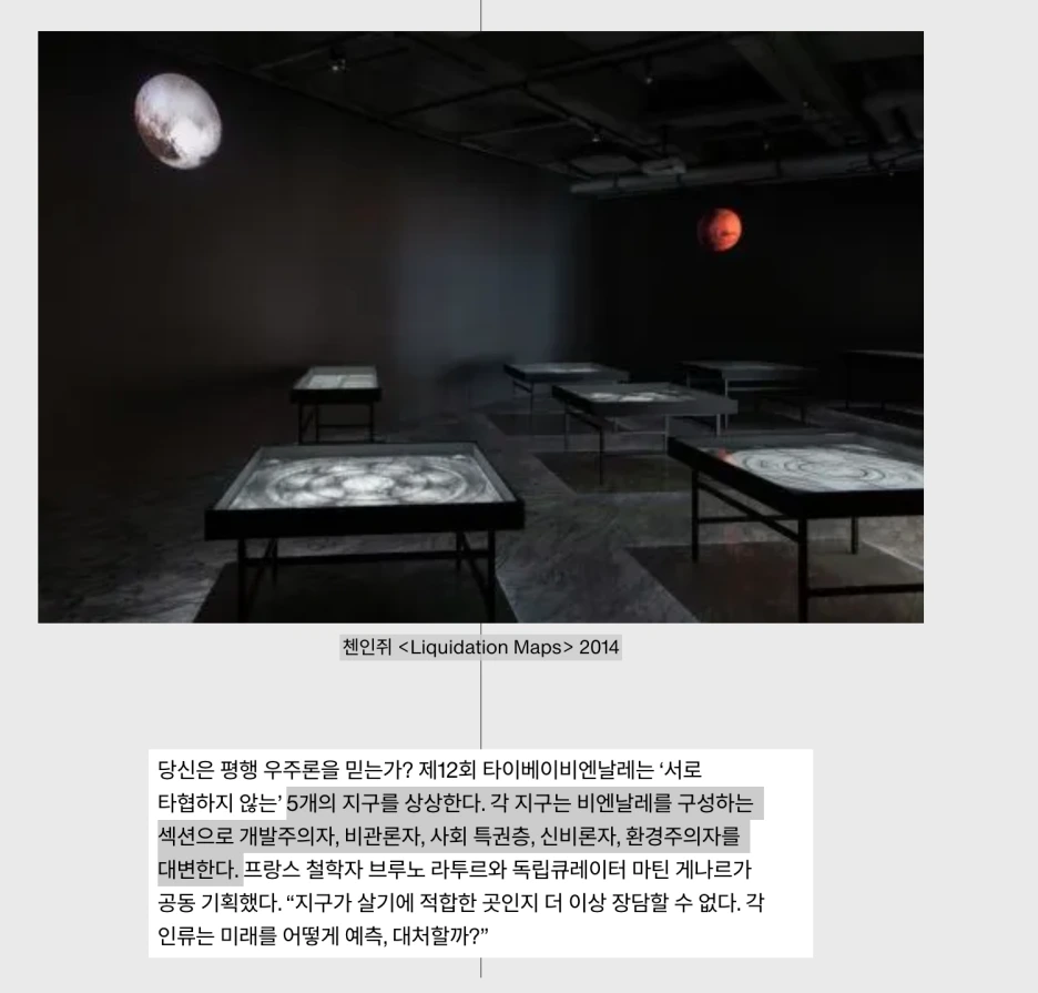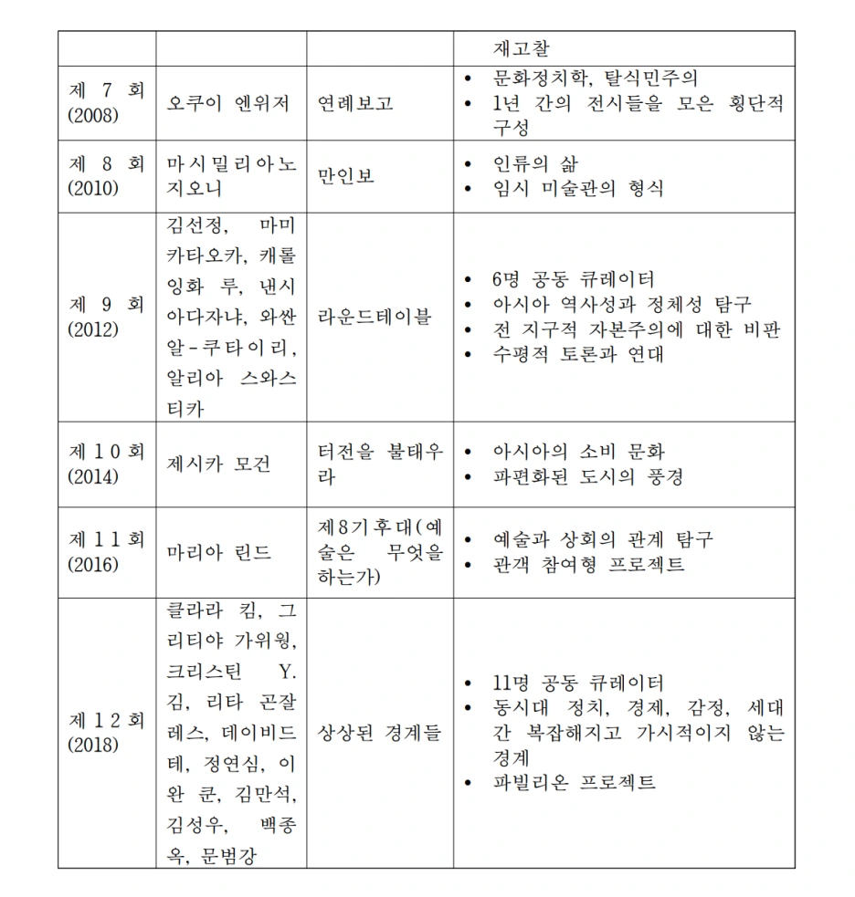 이 펀드는 우리 팀 내 출장 버짓과 달리, 간략한 자기소개서와 여행 계획을 제출해서 컬렉션 헤드들에게 통과되는 과정이 필요했다. 따라서 이유를 만들기 위해 여러 가지 다른 아시아권의 비엔날레 정보들도 찾아봤다. 내가 어떤 것을 얻고 싶은지, 어떤 것을 중점적으로 보고 싶은지 스스로 알기 위함도 있었다. 문제는 대부분의 아시아권에서 열리는 비엔날레가 외국인 초대 큐레이터들을 쓰고 있다는 점.