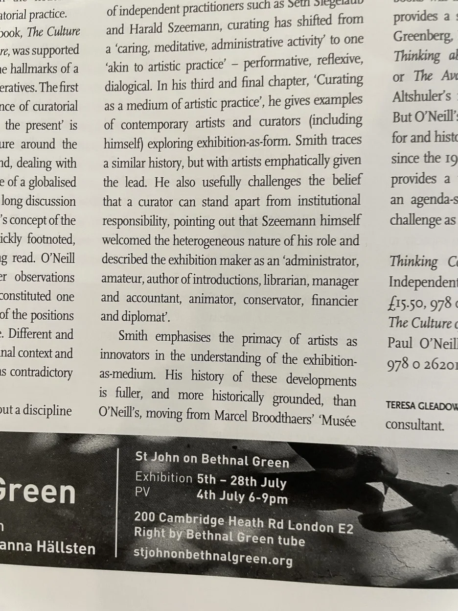 하랄드 제만(Harald Szeemann)이 한 말, Curating has shifted from a 'caring, meditative, administrative activity' to one 'akin to artistic practice'-performance, reflexive, dialogical. 내가 사실 싫어하는 변화. 큐레이터가 Practicitioner 가 되는 게 늘 맞나 싶다. 그 와중에 큐레이터 역할 설명할 때 'administrator, amatueur, author of introductions, librarian, manager and accountant, animator, conservator, financier and diplomat'라는 거 너무 공감.