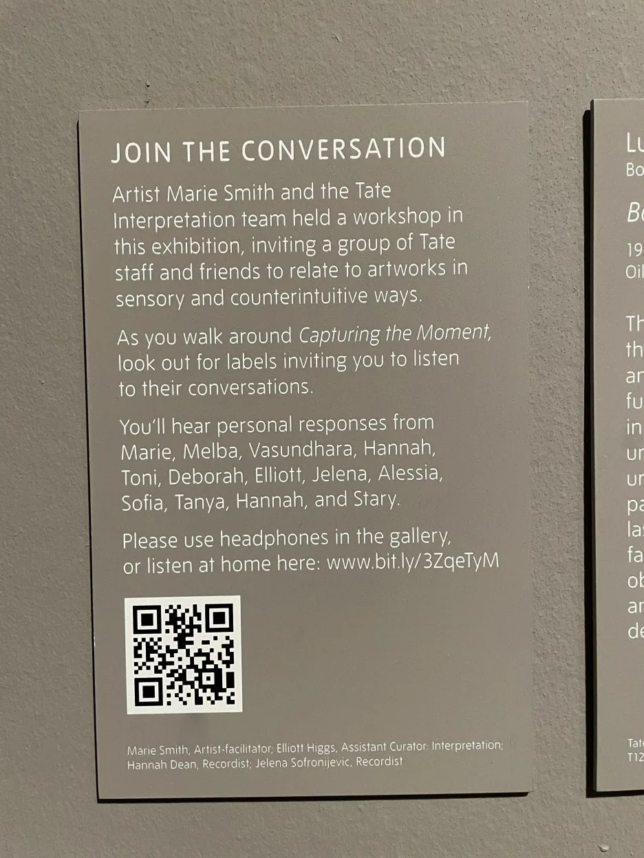 이런 코드 하나 들어간 패널이 실은 얼마나 많은 품이 들어가는 지. 큐레토리얼 팀의 피땀눈물. 우리 팀도 개관을 앞두고 많이 하는 interpretation approach 인데, 테이트도 Join the conversation 이라는 이름으로 했더라. 하지만, 빼곡히 전시된 그림에 눈이 바빠 사실 이렇게 QR 만 넣어서는 아무도 스캔해서 들여다 볼 여유를 못가질 것 같다. 품을 들인 만큼 꼭 스크린을 넣어서 노출/상영을 해야 한다는 게 내 의견.