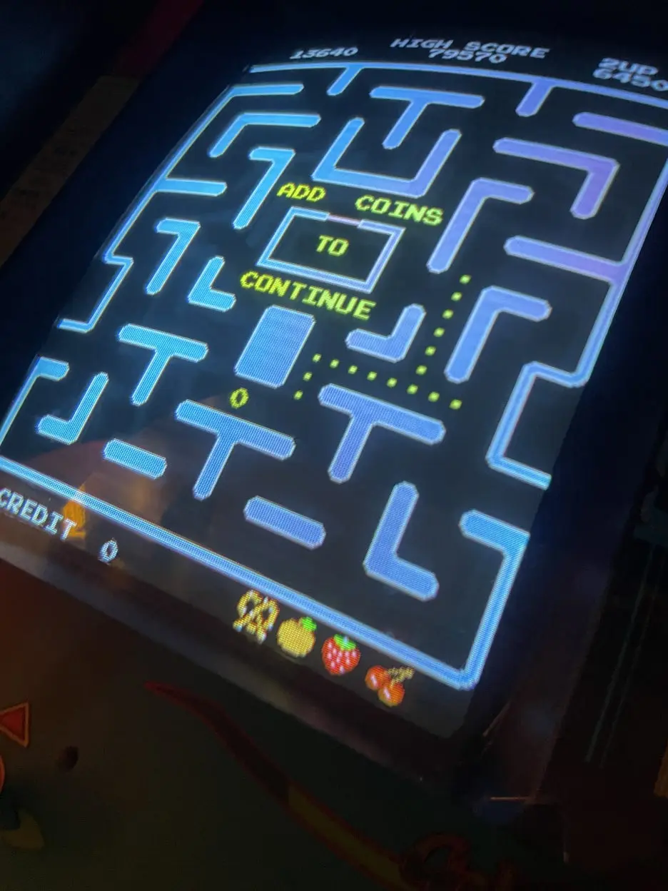 어른이 되어 보니 팩맨 속 과일과 프레첼을 먹는 시스템이 뭔가 귀엽다고 느껴지더라. 오른쪽 구석에 보이는 체리, 사과.
