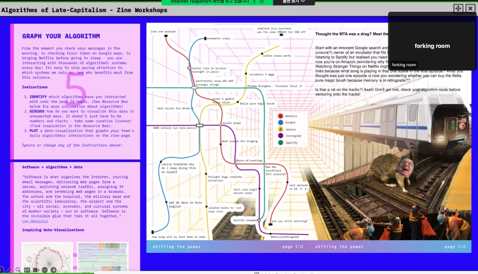 사이보그와 지각 기계에 대한 밈 페이지, 진 공동 창작 워크숍, 비평적 보드게임으로 구성된 <후기 자본주의 알고리즘> 프로젝트를 소개한다. 부조리, 유머, 놀이의 역할을 다각적으로 탐구하며, 다양한 대중이 AI 및 기타 알고리즘 기술에 대해 비판적 대화와 생각을 할 수 있도록 의미 있는 참여의 공간을 만든다.