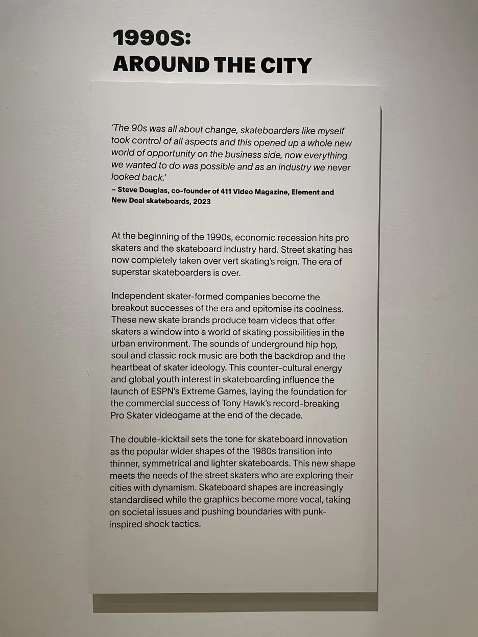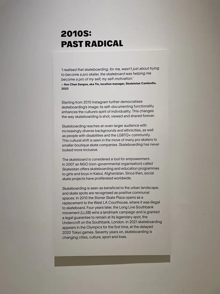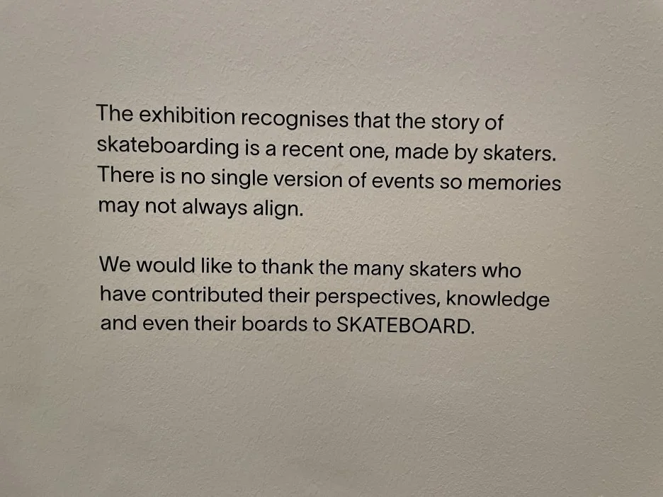 그래도 큐레토리얼 노력 중 하나는, 스케이트보드의 역사는 매우 최신 역사이자 보더들에 의해 만들어진 것이므로 단일한 스토리는 없고 기억들이 다 일치되지 않을 수 있다는 점을 전시는 인지한다는 것. 그리고 스케이트 보더들과 협력하여 그들의 지식과 관점을 공유하며 전시를 만들어나갔다는 점.