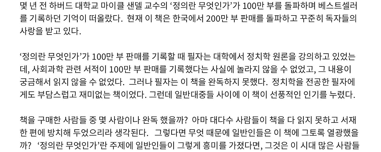 저번 일기에서 마이클 샌델의 책을 고등학교 때 논술 입시 차 읽었다고 언급했는데, 오늘은 또 우연히 이런 글을 봤다. 여기서 이분이 이 책을 완독한 사람이 거의 없다고 생각한 지점에서 놀랬다. 그리고 이어서 정말 내가 생각하는 것처럼 남들이 생각하고 행동하는 게 아니겠구나 느꼈다. 내가 보편성을 취득한 눈을 가지고 있지 않다면 앞으로 전시를 구성할 때나 대중을 대상으로 무언가를 벌일 때 어떻게 해야 하나 고민이다. 반면 이 분이 본인의 오만함으로 완독한 사람이 없다고 생각한 것 뿐 실제로는 읽은 사람이 많은 게 사실이라면, 그것 또한 고민되는 지점이다. 마찬가지로 나 역시 대중들이 이 작품 이해나 하겠어하는 식으로 생각해서 배제한 것들이 실제로는 오만한 생각에서 비롯된 것일 수도 있으니.