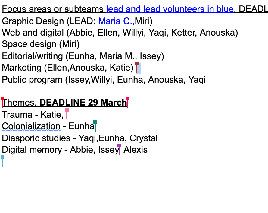 역할 분담을 했었다. 각자 특기 분야가 파악되고 나서는 각자 참여하고 싶은 자리에 이름을 적으면 된다는 결론이 났는데 즉각 수정이 가능한 구글 docx에 미팅 끝나자마자 분주하게 움직이는 커서들이 너무 웃겨서. ㅋㅋ 오색빛깔 여러 개의 커서들이 각자 자리를 찾으려고 움직이는 게 뭔가 귀여웠다.