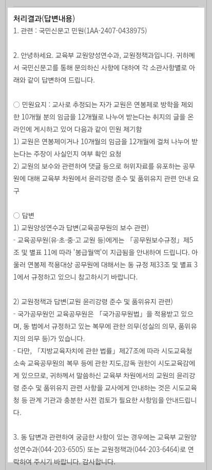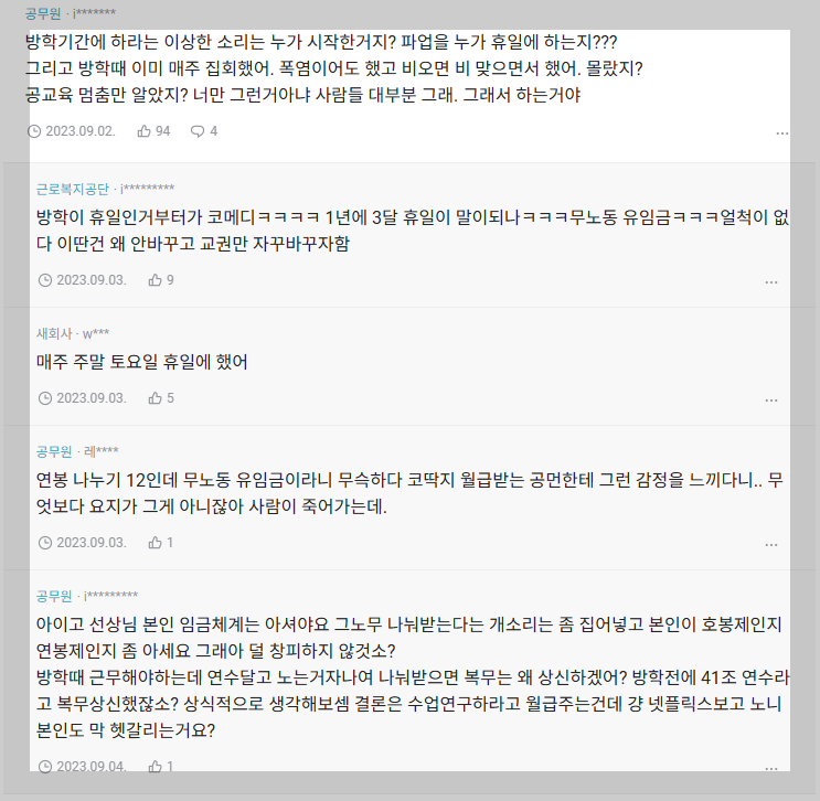사실, 교원이 바쁘고 할 일이 많고 고생이라고 주장하는 부분에 대해서는 반박하기 힘들다. 이것은 사람마다 다르기 때문이다. 그러니 이 부분에 대한 주장은 각자의 말이 옳다고 가정하는 것이 현명하다. 내 경험에 의하면, 교사의 일은 많지 않으며, 방학은 그냥 노는 것 같다만.