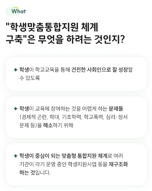학생이 교육에 참여하는 것을 어렵게 하는 문제들이 복합적으로 있으니 여러 기관이 운영하는 지원사업을 개인에게 맞춤하여 지원한다는 것이다.