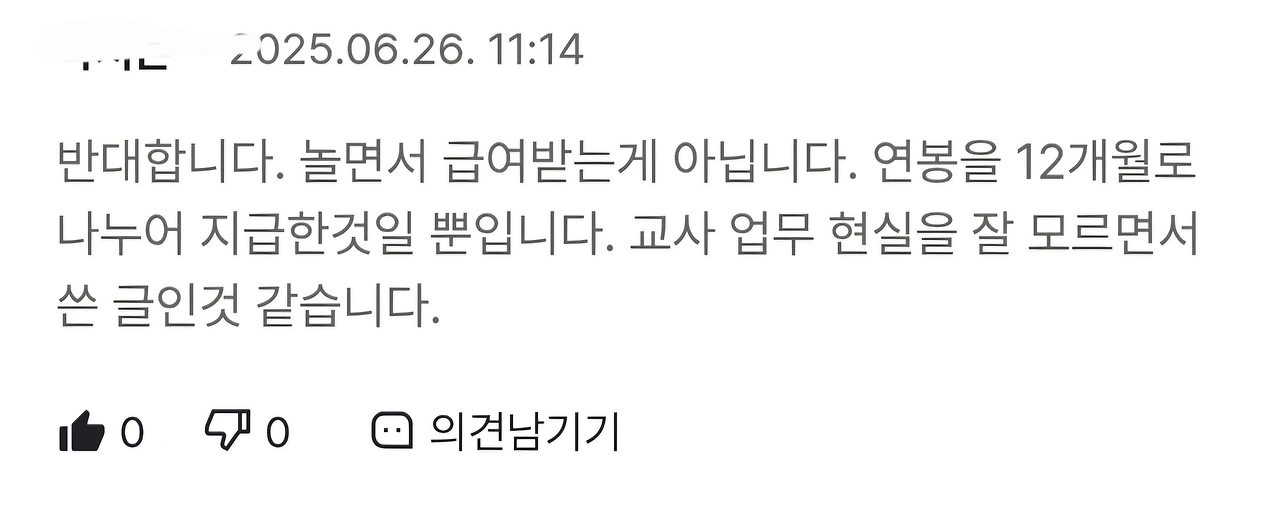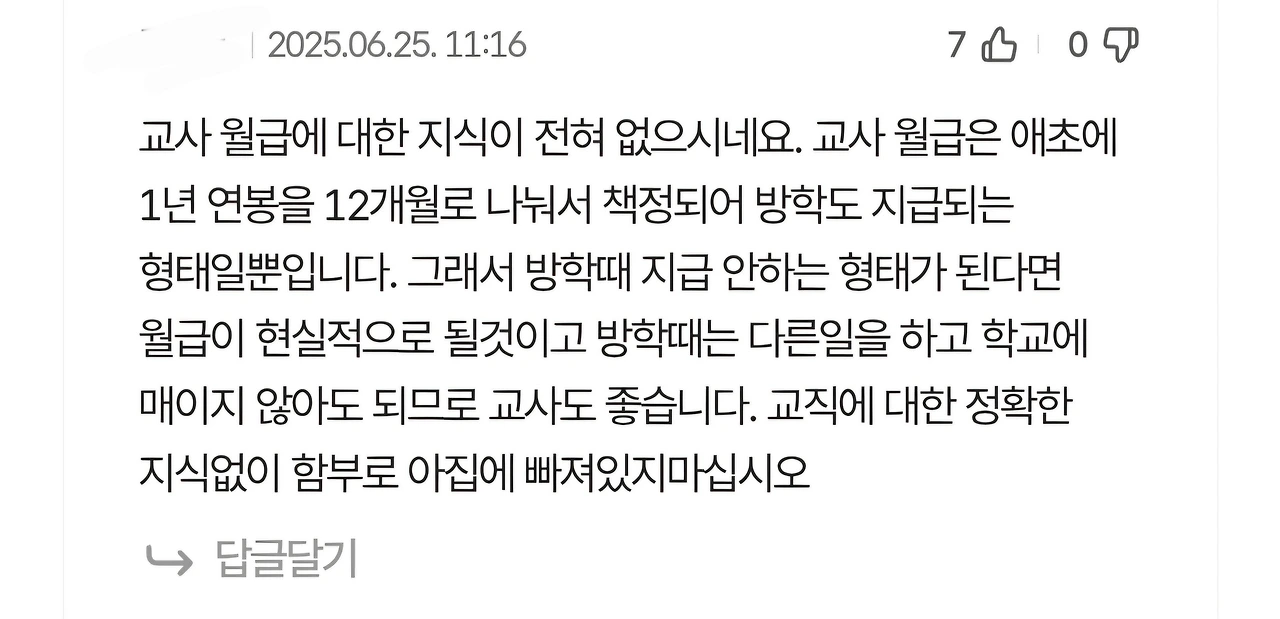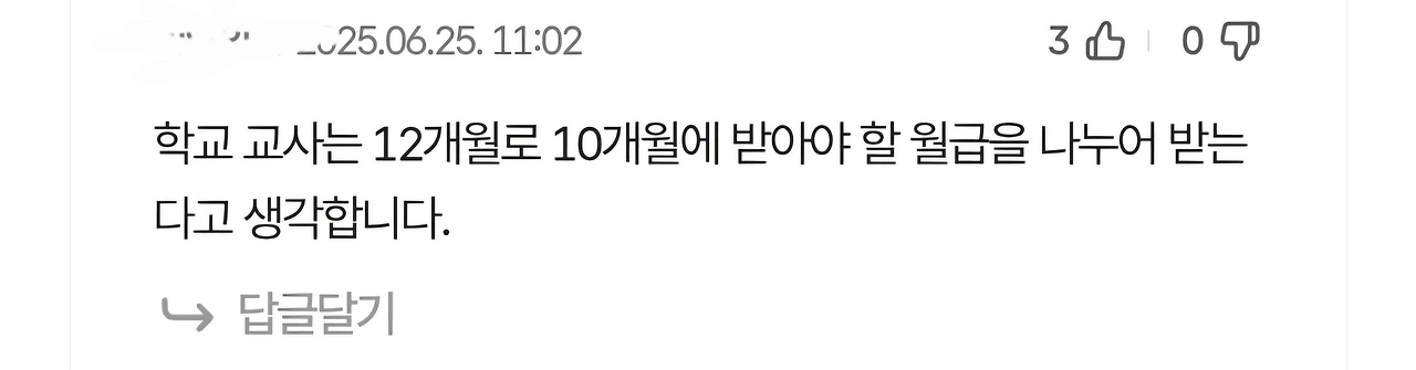 재미있는 것은, 어떤 교사(라고 추정되는 분)가 '교사는 연봉을 12개월에 나누어 받는 거다' 따위의 글을 올리면 여기에 대해 아니라고 하는 교사는 한 번도 본 적이 없다는 겁니다.