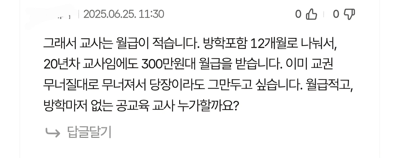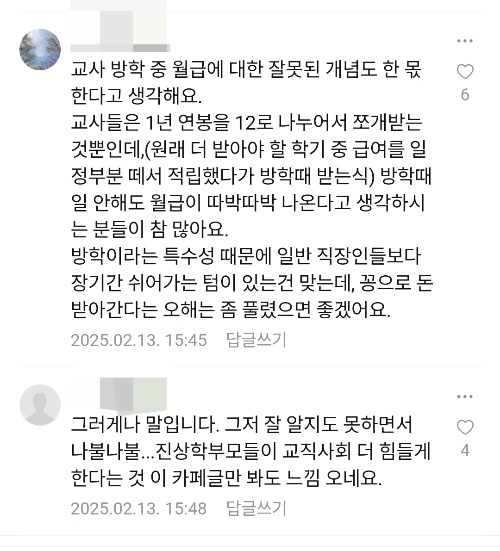 학기 중 근무한 것으로 연봉이 정해지고 그것을 12달로 쪼개서 받을 뿐인 방학을 고깝게 보아 교사를 욕한다고 징징대는 겁니다.