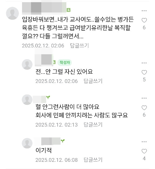 댓글에서 보듯이, 병가든 육휴든 유리한 건 죄다 쓰겠다. 당연한 거 아니냐는 생각이 교사들 사이에서는 꽤나 많은 비중을 차지하는 것 같습니다.