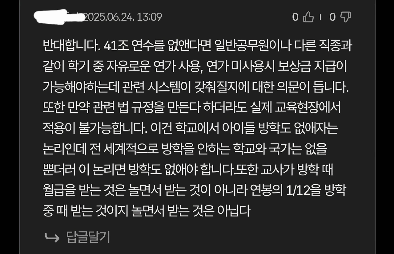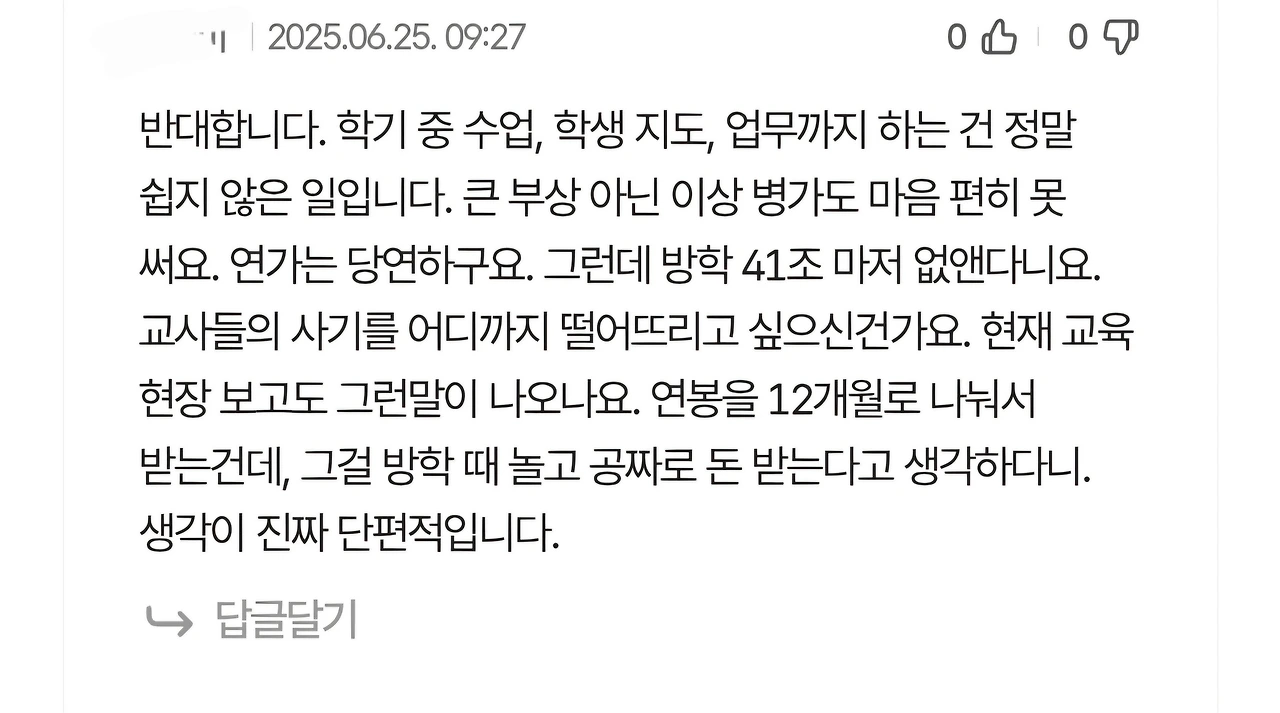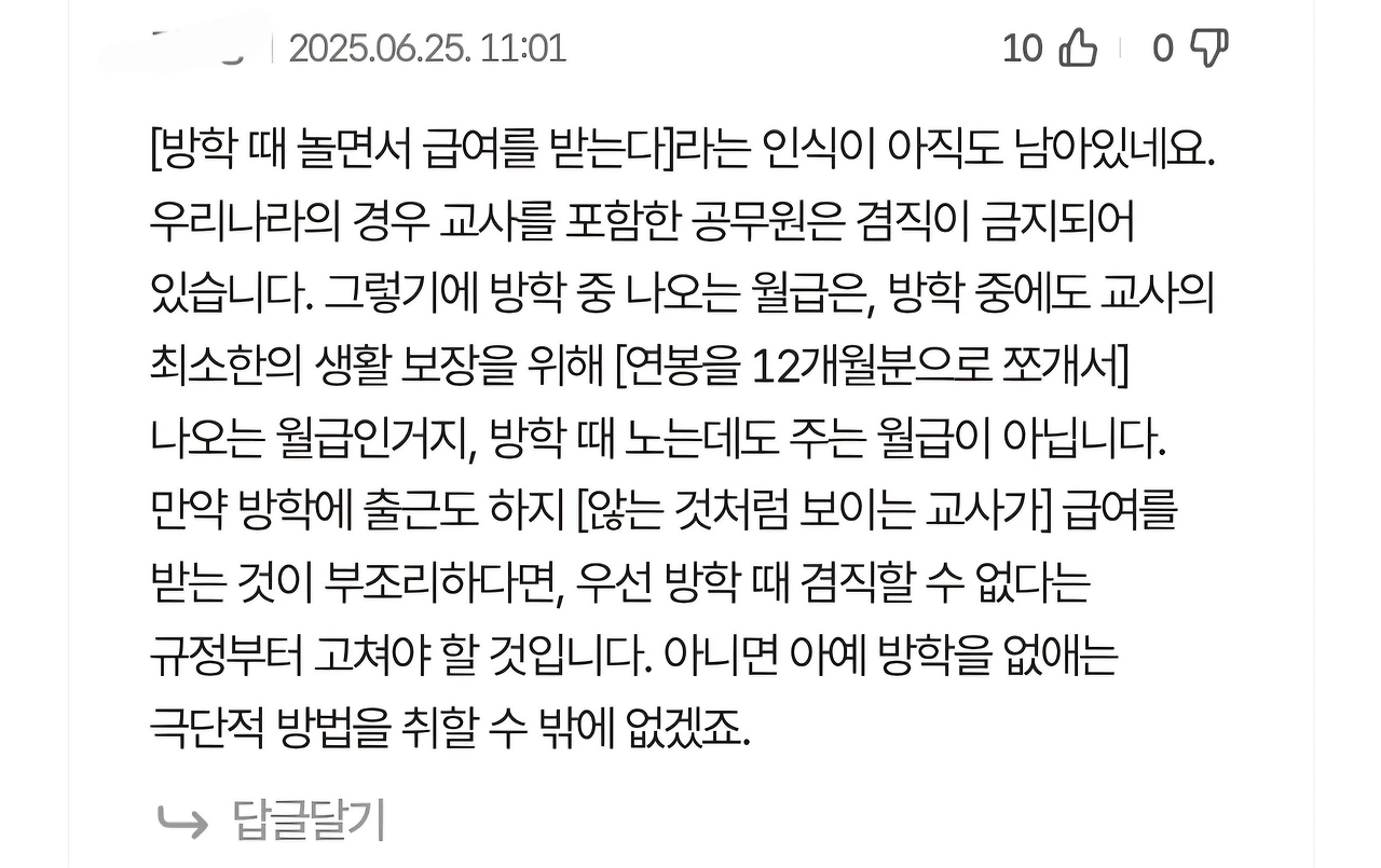 교사들이 방학 때 아무 일도 하지 않고 편하게 놀면서 월급을 받지 않느냐는 비판에는 늘 다음과 같은 댓글이 달립니다.