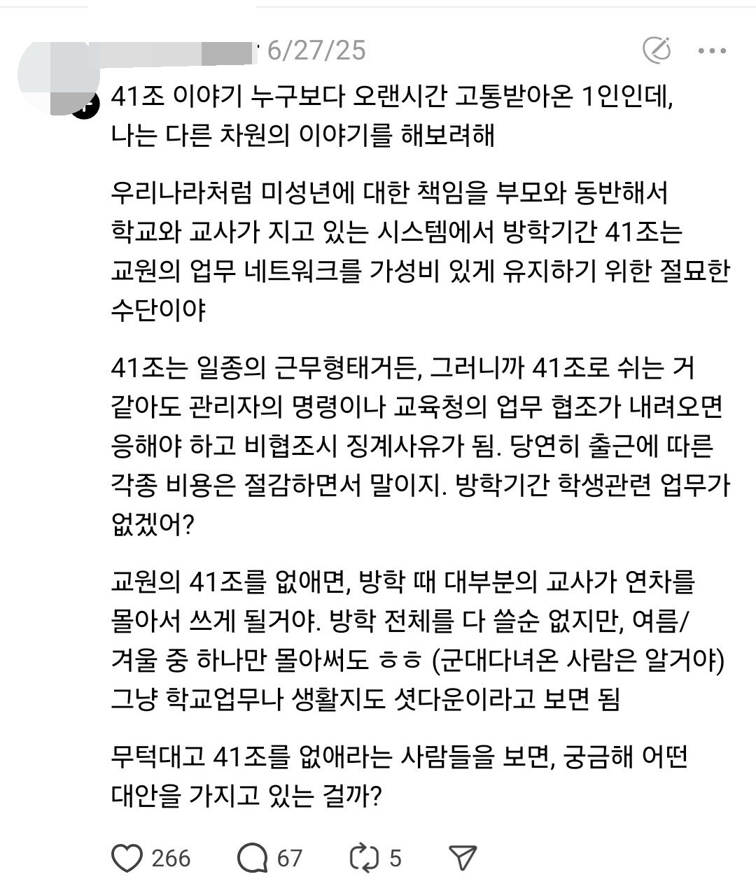 출근에 따른 각종 비용을 아낀다는 취지로 가성비 이야기를 꺼낸 것일 수도 있는데, 대부분의 교사가 1년에 두 번씩 자체적으로 경력단절을 함으로써 생기는 교원의 질적 문제에 비하자면 우스울 정도로 적은 금액입니다.