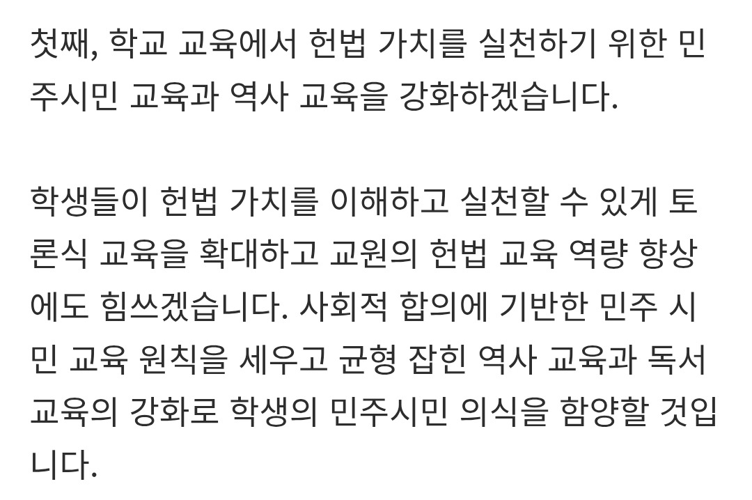 그리고 '교원의 헌법 교육 역량'이라는 듣도 보도 못한 것이 등장했는데, 헌법이라는 것이 '교육의 대상'이라고 보는 단순하기 그지없는 생각도 생각이지만, 문장의 마지막까지 헌법의 가치가 뭔지 구체적으로는 말을 하지 않는 답답함은 속이 터질 지경이다.