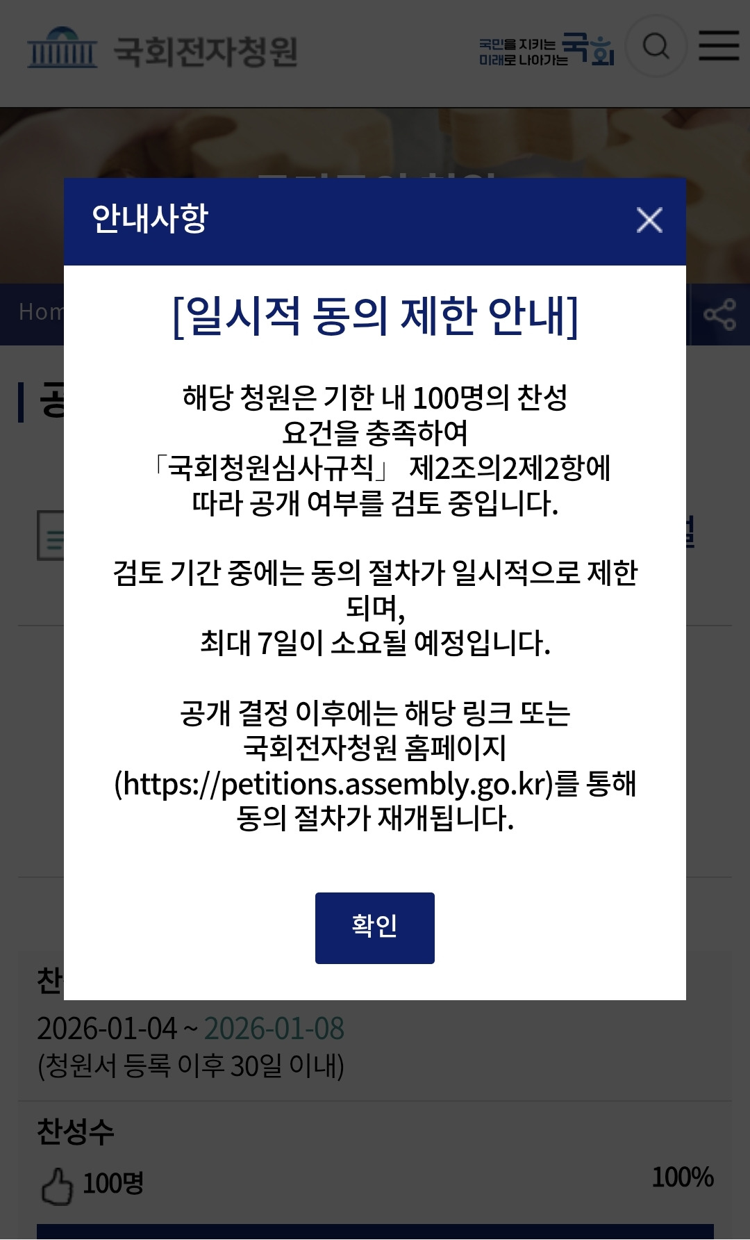 100명의 동의인을 모아 공개청원의 자격을 얻었습니다.