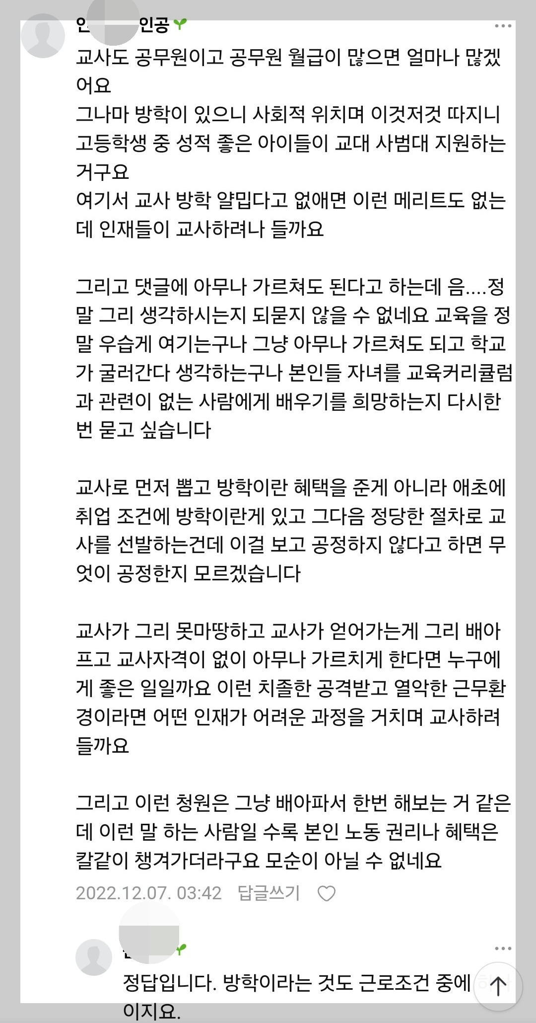 교사가 41조 연수규정을 악용하여 방학 때 놀고 있다는 비판에 대한 대답으로 '방학은 교사를 위한 재충전 시간'이란다. 이것은 교사들이 방학을 어떻게 생각하는지를 잘 보여줌과 동시에, 그들의 특권의식이 대단하다는 것을 알려준다.