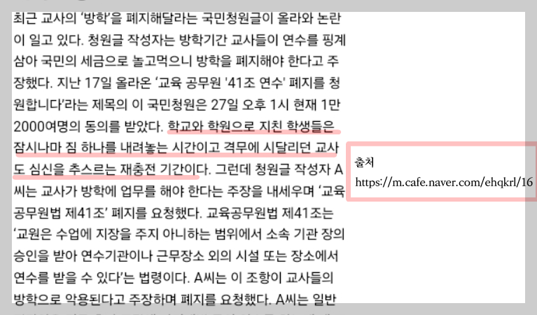 청와대 청원에는 교사의 41조 연수폐지에 대한 안건이 올라온 적이 있었다.