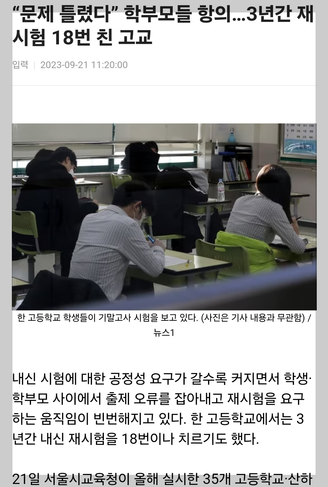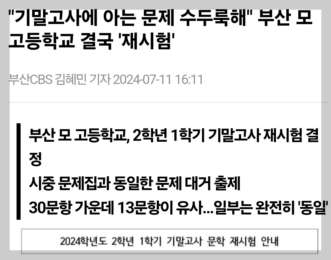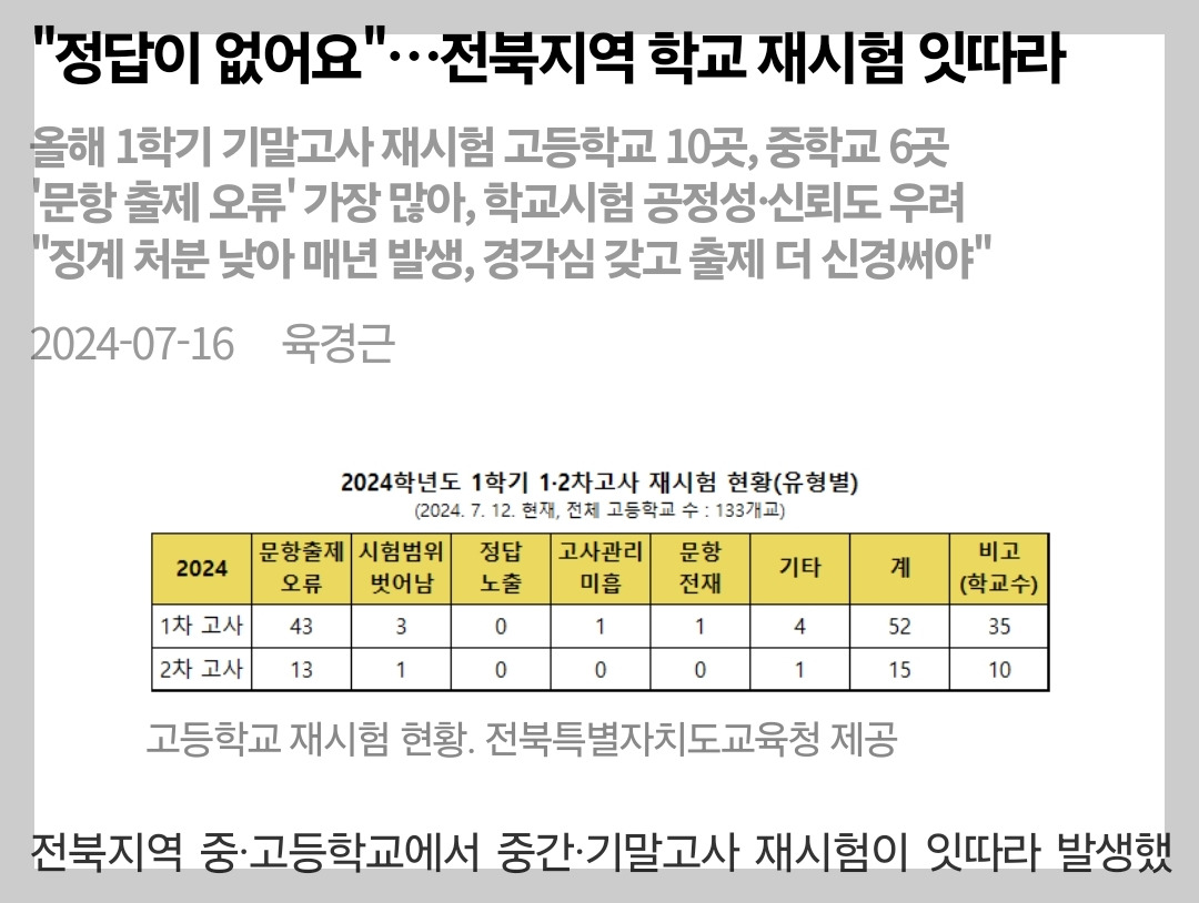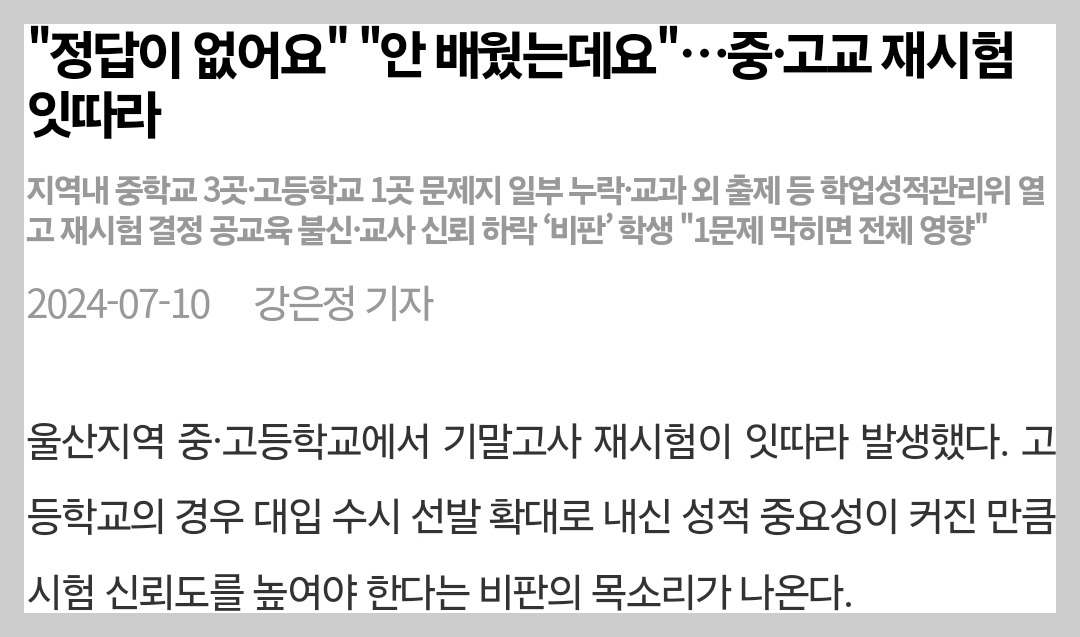 2024년 7월 기말고사 기간에만 한정해서, 부산, 울산, 전북 등 지역을 가리지 않고 '재시험' 소동이 일어났다. 기사를 보자면 어쩌다 발생하는 일도 아닌 그야말로 '매년' 반복되는 일이란다.