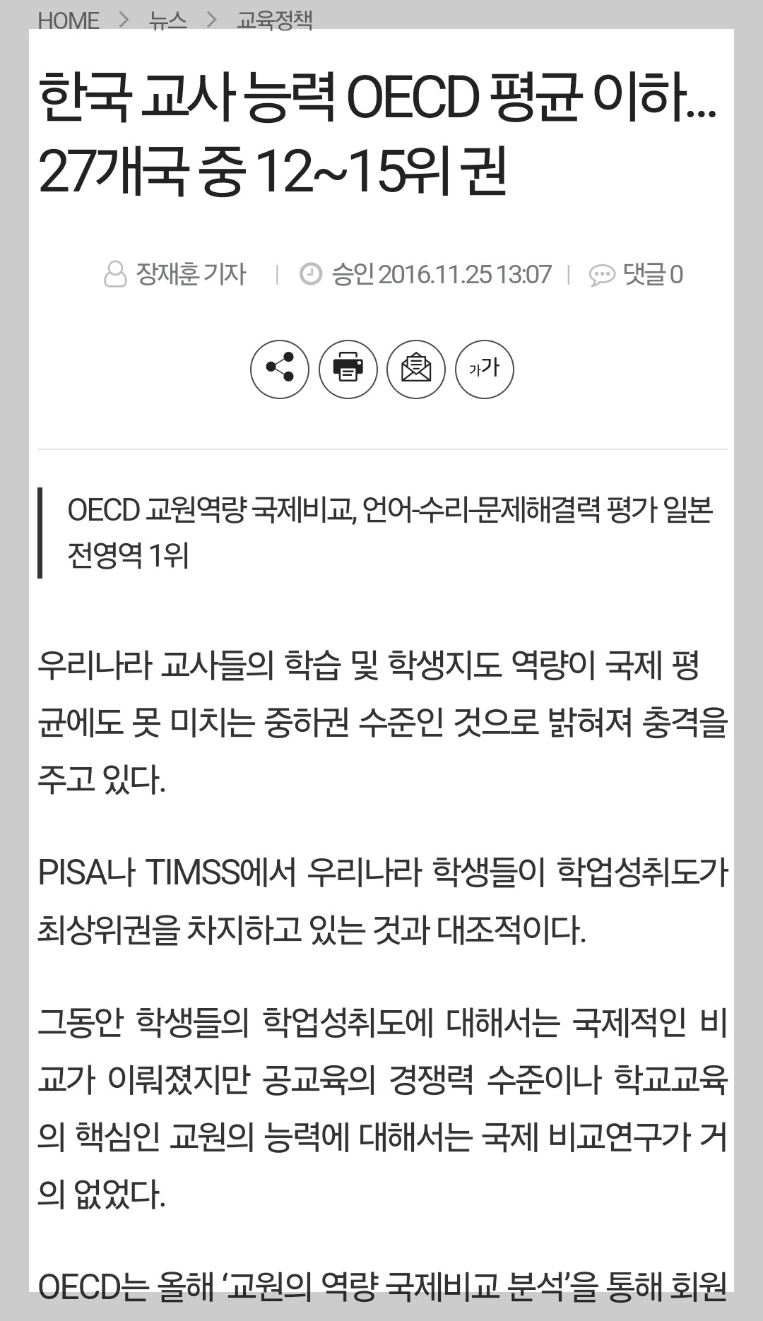 2016년 자료이기는 하지만, 기사본문에서도 나와있듯이 교원 간 국제비교는 희귀하므로 가져왔다.