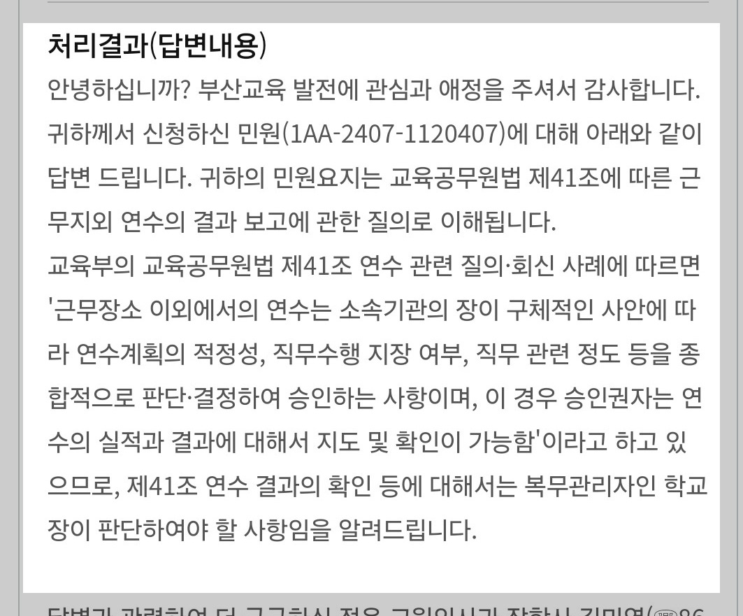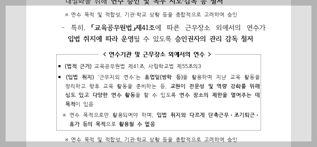 비록 한 두 줄에 불과하기는 하지만, 교육부가 저리 명확하게 41조 연수가 남용되지 않도록 주의하라고 하는데, 일선 교사들은 무슨 배짱으로 41조 연수를 휴가처럼 사용하는 걸까?