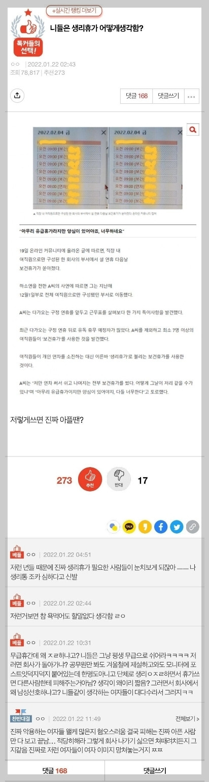 요약하면, 어느 회사에서 명절 연휴 전날 대부분의 여사원들이 '생리휴가'를 쓴다는 것인데, 댓글 반응은 그야말로 대동단결하여 '너무했다'는 입장이다