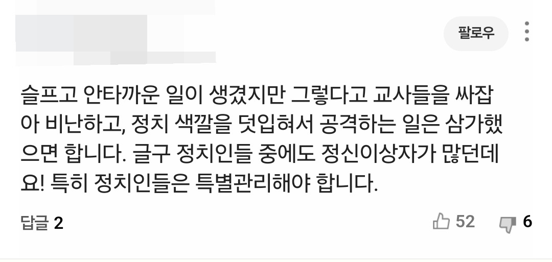 그 후에 기사가 바로잡혀 정교사, 그것도 담임교사라는 것이 확인이 되었을 때도 그들은 교사들에게 화살을 돌리지 말 것을 주장했다.