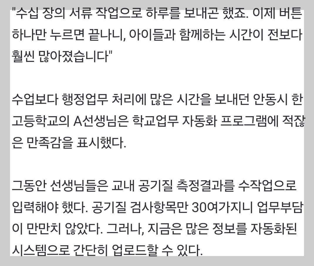 나는 이 인터뷰가 가짜라는 심증을 가지고 있다. 공기질측정 업무가 뭐고, 어떻게 하는지를 알며 실제로 그 업무를 하는 교사가 있다는 것조차 믿을 수 없는데다, 어느 학교에 훌륭한 교사가 계셔서 학교환경위생업무를 무슨 이유에선지 스스로 떠맡아 학고 있다고 한들. (일빈교사가 할 필여가 없는 업무이다) 그것이 업무가 많다고 징징잴 성격이 아니기 때문이다.