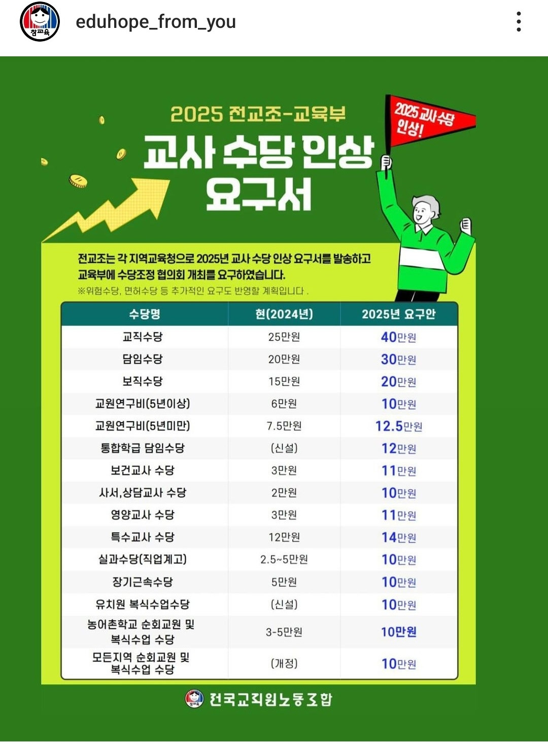 교원수당이라는 것도 생각해 보면 우습다. 어떤 직책을 맡거나 어떤 활동을 해서 받는 수당이 아니라 교사라면 모두가 받는 수당? 이것이 기본급이 아니고 뭐란 말인가. 특수직무수당의 성격으로 보기에 50만 명은 너무 많고, 업무 자체가 어렵고 위험하다는 사회적 동의도 없다. 게다가 현행 25만 원은 수당치곤 너무 크지 않은가?