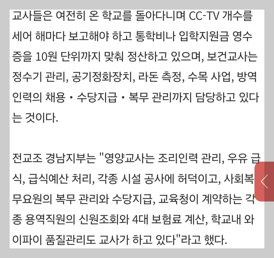 충격적인 것은, 본문에 나오는 그 업무들 또한 보건교사, 영양교사들이 안 하는 경우가 많다는 것인데, 이건 언젠가 따로 얘기하겠다.
