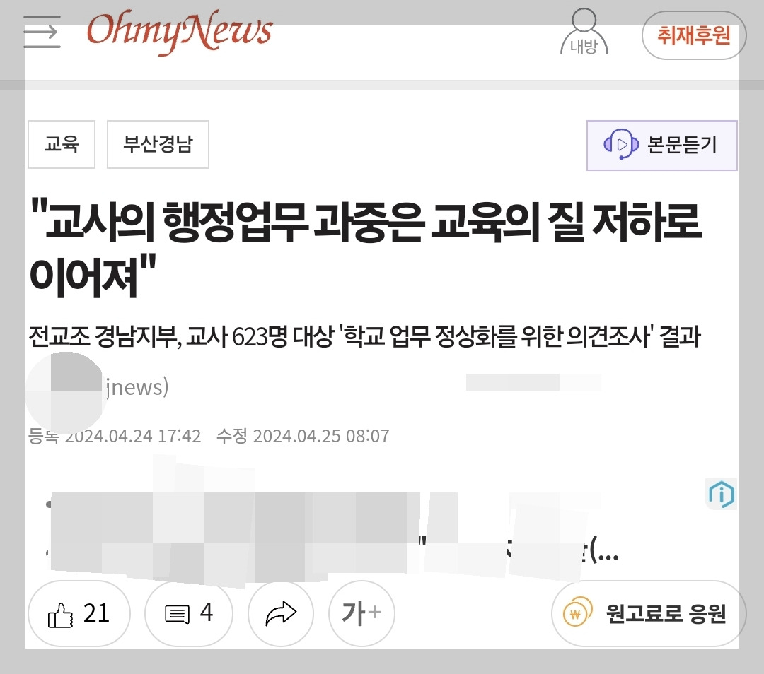 지금 교사가 (오마이뉴스의 이런 기사는 정식 기자가 취재를 해서 작성한 것이 아니다. 시민기자라고 하는 '이해당사자'가 자기주장을 할 뿐이다) '교육의 질'을 인질삼아 하고 싶은 주장을 하는 모습을 보실 것이다.