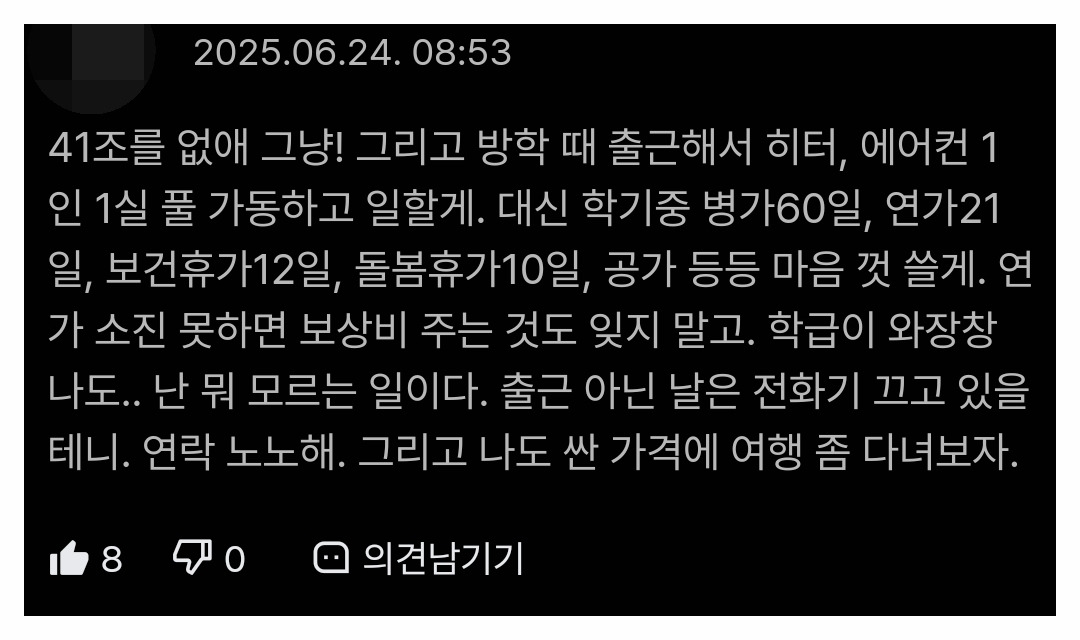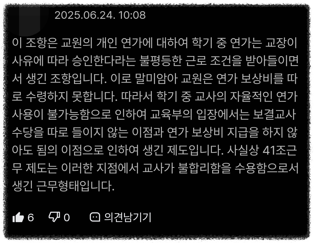 그럴싸하게 말을 해서 마치 41조를 폐지하기라도 하면 교원의 연가보상비나 시설관리비로 국고가 바닥나고 교육이 무너질 것처럼 겁을 주는 글도 많았는데, 두 개 정도만 보고 이야기를 이어가겠습니다.