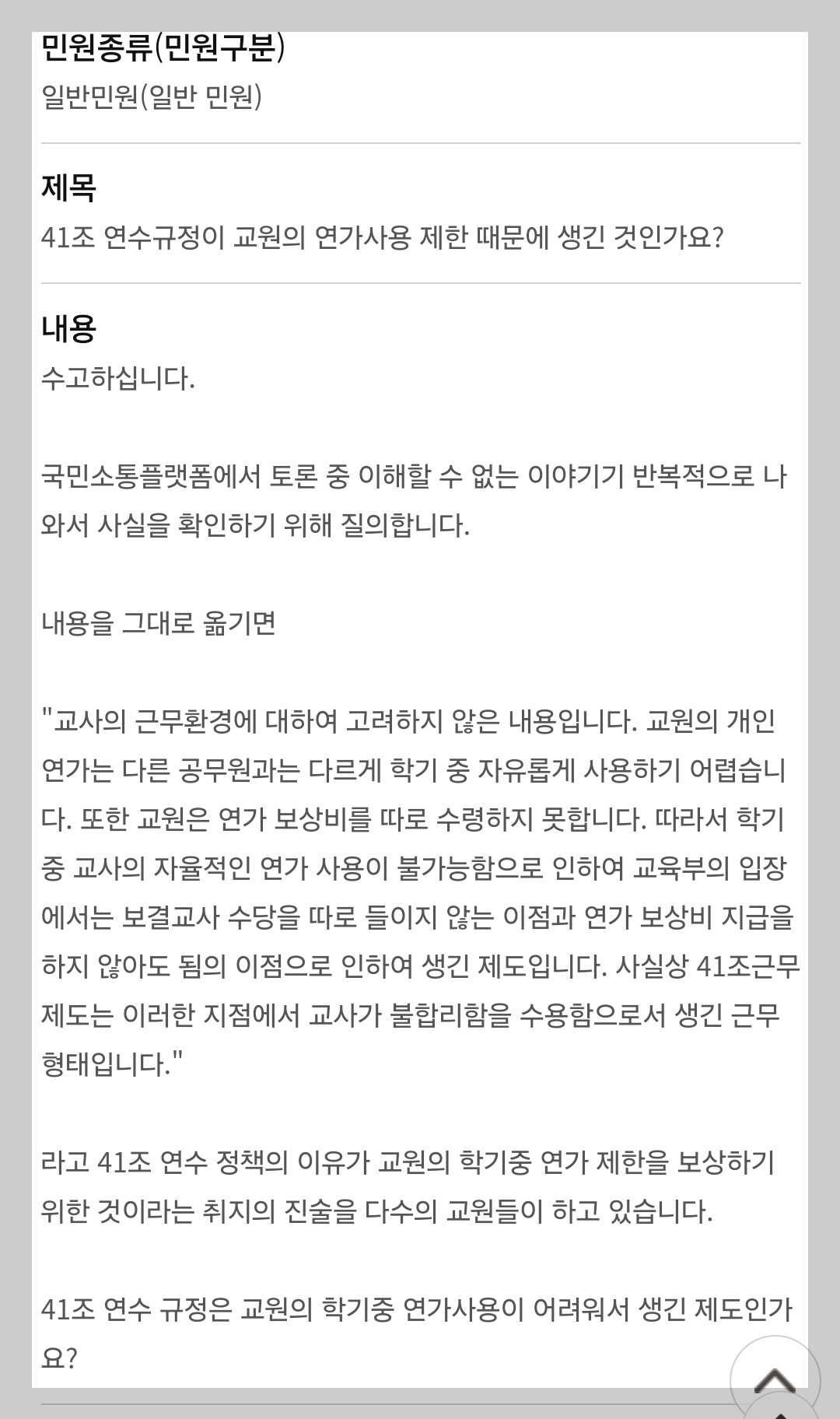 하지만 교원들이 하는 말의 앞뒤만 맞춰보고 판단해서는 안된다는 경험이 있으므로 (그 유명한 연봉제 드립 같은) 국민신문고에 문의했습니다.