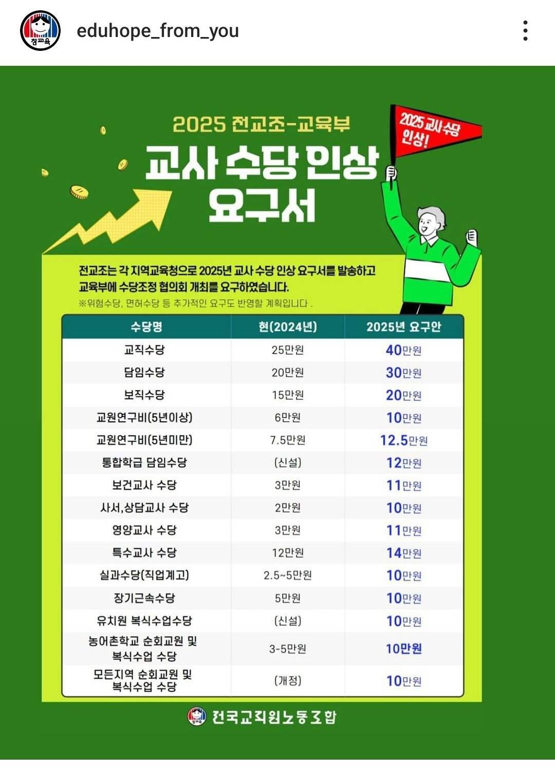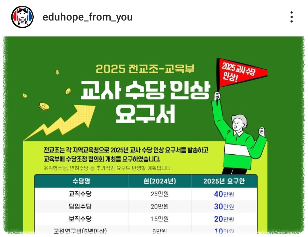 교직수당을 25만 원에서 40만 원으로