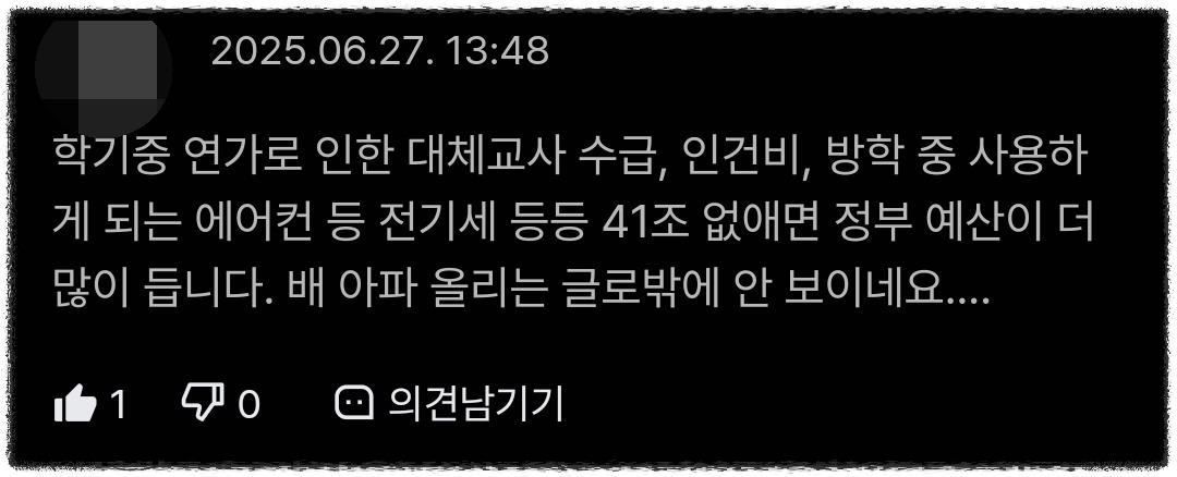 무엇보다도 저는 교원분들이 학교재정이 파탄 날까 걱정하시는 모습이 몹시 낯설게 느껴집니다.
