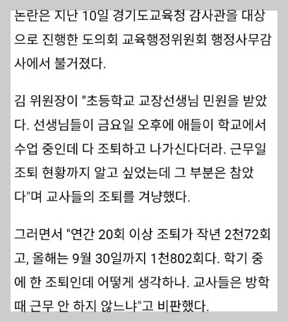 그러니까 경기도에서만 수 천명의 교원이 매주 1번 이상 조퇴를 하면서도 "교원은 연가를 자유롭게 사용하지 못해요. 심지어 작년엔 하루도 안 썼다고요!"라는 주장이 당당하게 나오는 거겠다는 제 추측입니다.