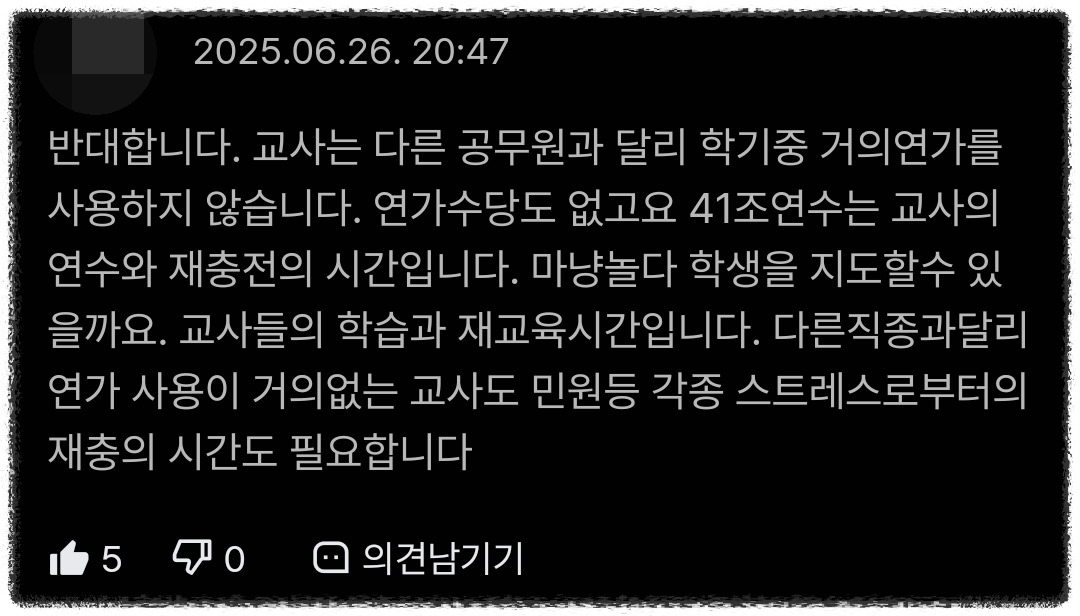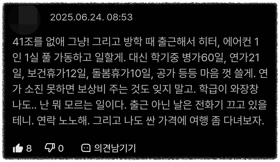 천에 하니 만에 하나 41조 연수가 폐지라도 되어버리고, 그 반작용으로 교원에게 연가보상비 지급이 결정된다 하여도 그것은 문제가 아닙니다.