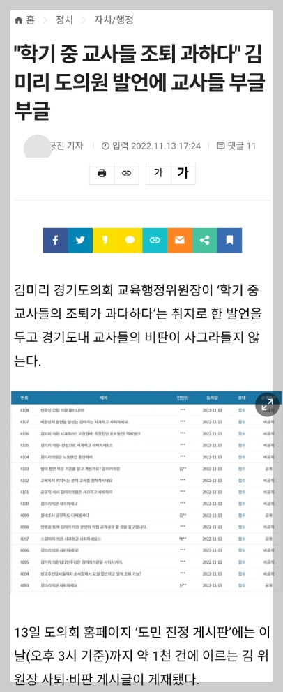 교원들의 도 넘은 연가사용(조퇴)으로 학교운영이 어렵다며 교장들이 시의원에게 하소연한 것입니다. 하루, 그것도 오후 3시경인데 댓글만 1천 여개가 달렸다는 문장은 어디선가 많이 보던 상황이죠?