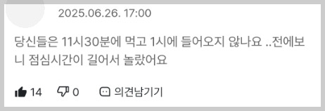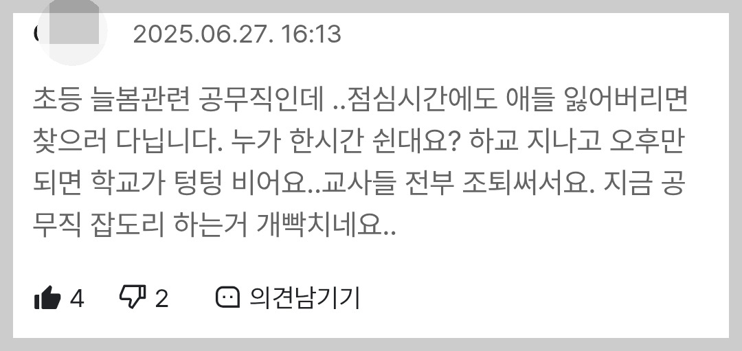 2시간에 달하는 점심시간, 조퇴(연가)... 점심시간이야 특별한 경우라고 치더라도 조퇴(연가)에 대한 의견은 꾸준히 올라오고 있습니다.