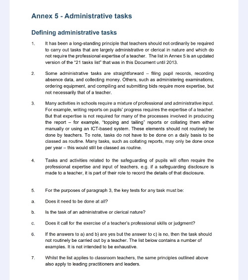 교사에게 요구할 수 없는 행정업무 리스트가 명시되었지만 실질적 효력은 없을 것으로 영국 교사 노조들은 입을 모으고 있다. 학생관련이나 책임이 큰 문서 작성을 대신하기에는 TA 자격이 부족해 어쩔 수 없다는 것. 노조들은 좀 더 실질적인 형태의 '성과압박의 완화'를 주장하고 있다. (행정업무 경감이라기 보다는)