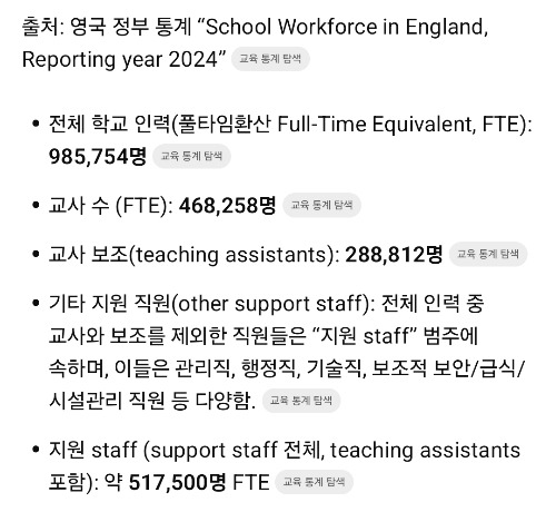 47만 명의 교사에 29만 명의 교사보조(TA)가 있다.
