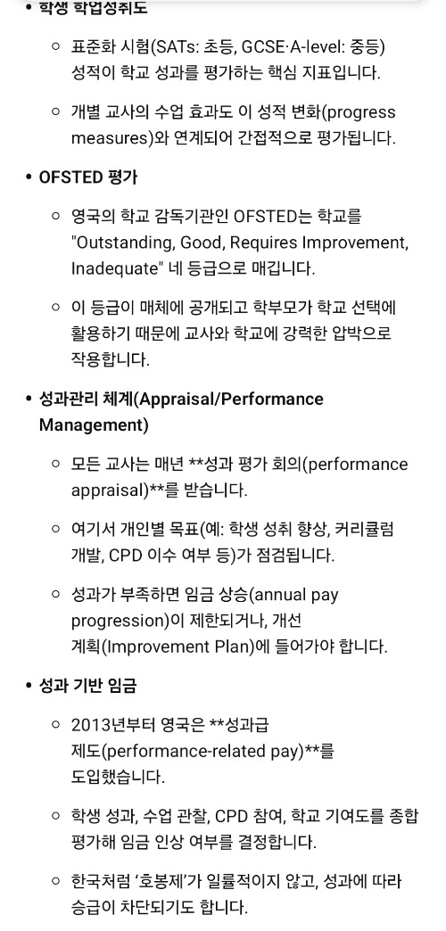 여담으로, 영국의 교사노조는 평가의 필요성과 성과관리의 필요성은 인정하되 방법과 형식을 문제 삼는 중. 개인적으로는 평가조차 거부하는 한국 교사들은 도대체 뭐지하는 생각.