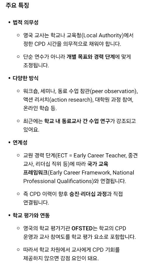 영국은 연간 190일을 수업하는 날이고, 수업시간의 10%를 수업준비와 평가시간으로 보장받으며, 수업하는 날의 나머지 시간과 수업이 없는 5일은 '다른 업무(other task)'를 해야 한다.